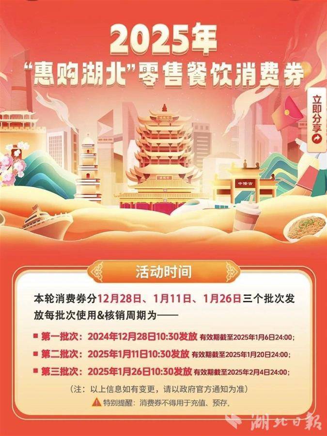 岁末年初,省市联动投入1亿元2025年“惠购湖北”零售餐饮消费券,营造“年味浓、活力足、人气旺”的消费市场氛围,让广大群众度过欢乐祥和的春节。第一批、第二批零售餐饮消费券已于2024年12月28日和2025年1月11日发放,累计发券240万张,拉动消费超3800万元。