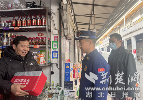 消防监督员为农贸市场商户送上消防应急包。通讯员 杨丽 摄