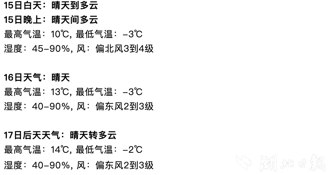 昨日武汉市阴天,局部有短时小雨,最低气温7℃~11℃,最高气温大部地区14℃~16℃。今日早晨多云到晴天,最低气温中心城区3℃~5℃、其他大部-1℃~2℃。预计15日白天受冷空气南下影响,北风增强、气温下降。这两天受高空波动和弱冷空气影响,武汉市天空云量较多,部分地区有弱降水发生,还伴有较强的北风,增添了“三九天”的寒意。