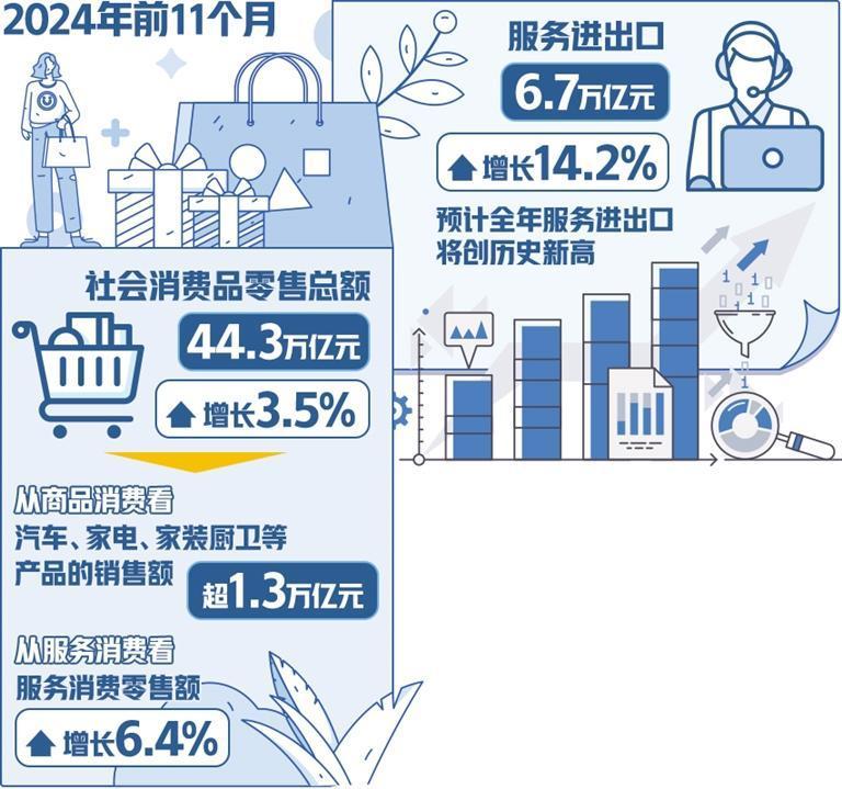 国内消费平稳增长。2024年前11个月社会消费品零售总额44.3万亿元,同比增长3.5%。从商品消费看,在消费品以旧换新等政策带动下,汽车、家电、家装厨卫等产品的销售额超1.3万亿元。其中,绿色、智能产品备受青睐,特别是新能源汽车、一级能耗的家电产品、智能家居产品等。从服务消费看,随着服务消费新场景新常态的持续涌现,服务消费的潜力不断释放,2024年前11个月服务消费零售额增长6.4%,其中信息类、文娱类消费比较活跃。