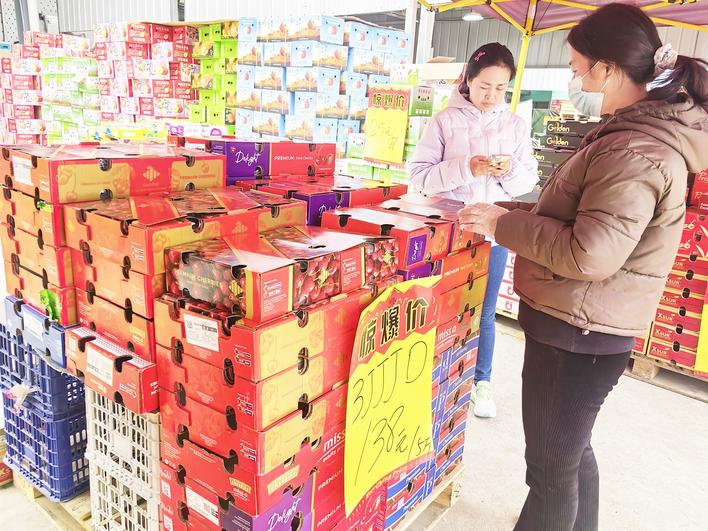 不过,在旁边另一家把一箱箱车厘子摆到路面上的批发商处,给出了拉宾车厘子一箱10斤88元的“地板价”,吸引众多前来采购的市民们关注。