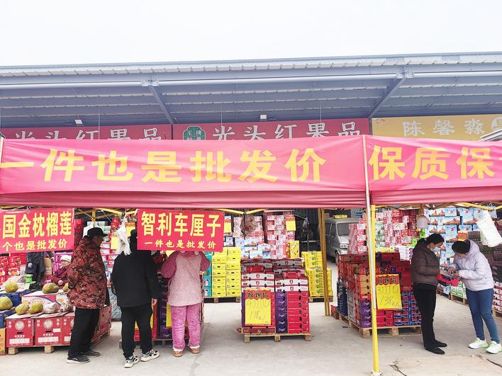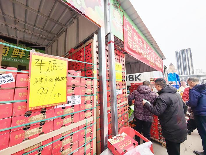 1月14日上午,记者来到位于汉口北的新华南果品批发市场,远远就能看到“智利车厘子,一件也是批发价”的大横幅在风中飘荡,目之所及都是堆得整整齐齐的车厘子礼盒。