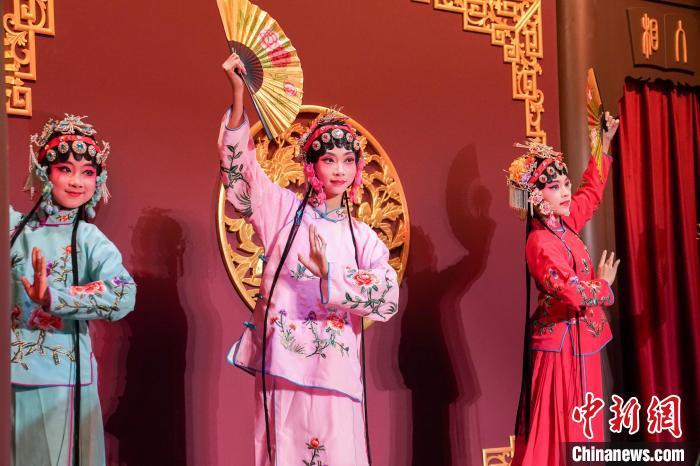 1月15日晚,广西南宁新会书院,南宁市解放路小学学生上演戏曲行当展示《邕城戏韵》。中新社记者 陈冠言 摄