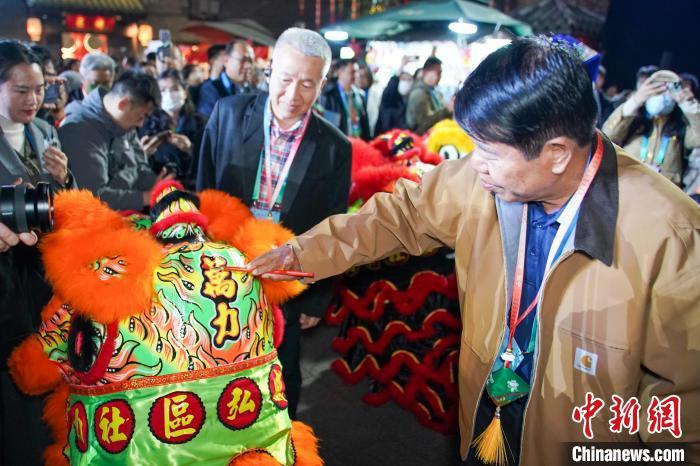 图为嘉宾在邕州古城·三街两巷参加舞狮点睛仪式。中新社记者 陈冠言 摄