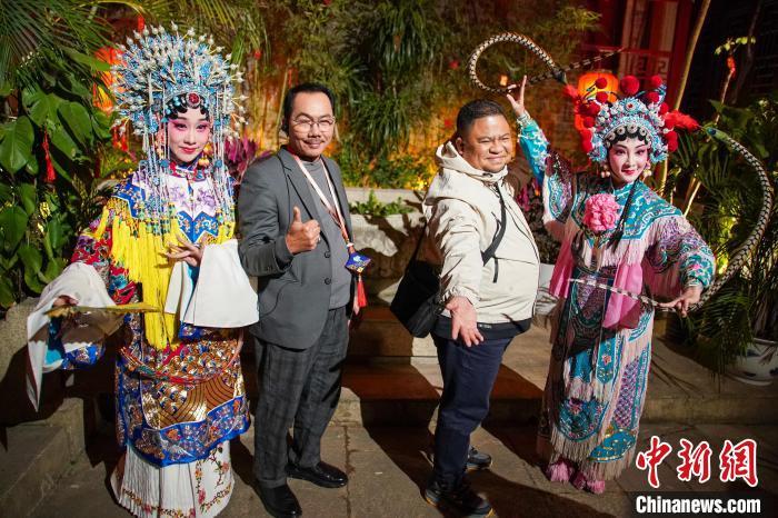 1月15日晚,参加“世界市长对话·南宁”活动的东盟国家嘉宾在广西南宁新会书院参观时与邕剧演员合影。中新社记者 陈冠言 摄