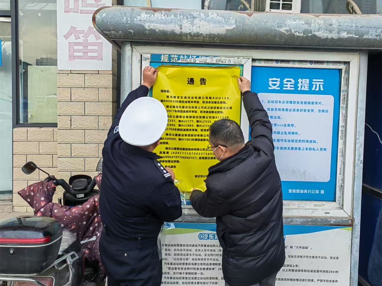 1月15日上午10时,武昌区交通大队民警来到宏基客运站,仔细检查站内车辆,并叮嘱司机:“出车前一定要做好全面检查,提醒乘客全程系好安全带。”在青年路客运站,江汉交警将隐患车辆和驾驶员进行黄榜公示,严禁其上路。