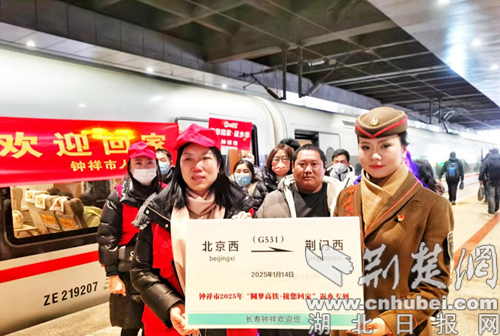 荆楚网(湖北日报网)讯(通讯员 王俊 钟国庆)1月14日,春运首日,钟祥96名在京务工人员踏上了温暖的回家之旅,他们免费乘坐由北京西站开往荆门西站的G531列车返乡过年。
