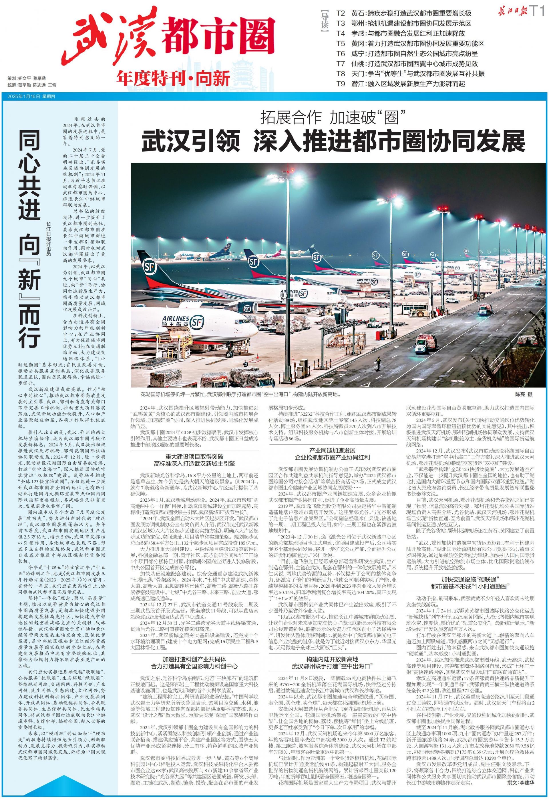 2024年,武汉围绕提升区域辐射带动能力,加快推进以“武鄂黄黄”为核心的武汉都市圈建设,引领圈内城市拓展合作领域、加速破“圈”协同,深入推进协同发展,同城化发展成效凸显。