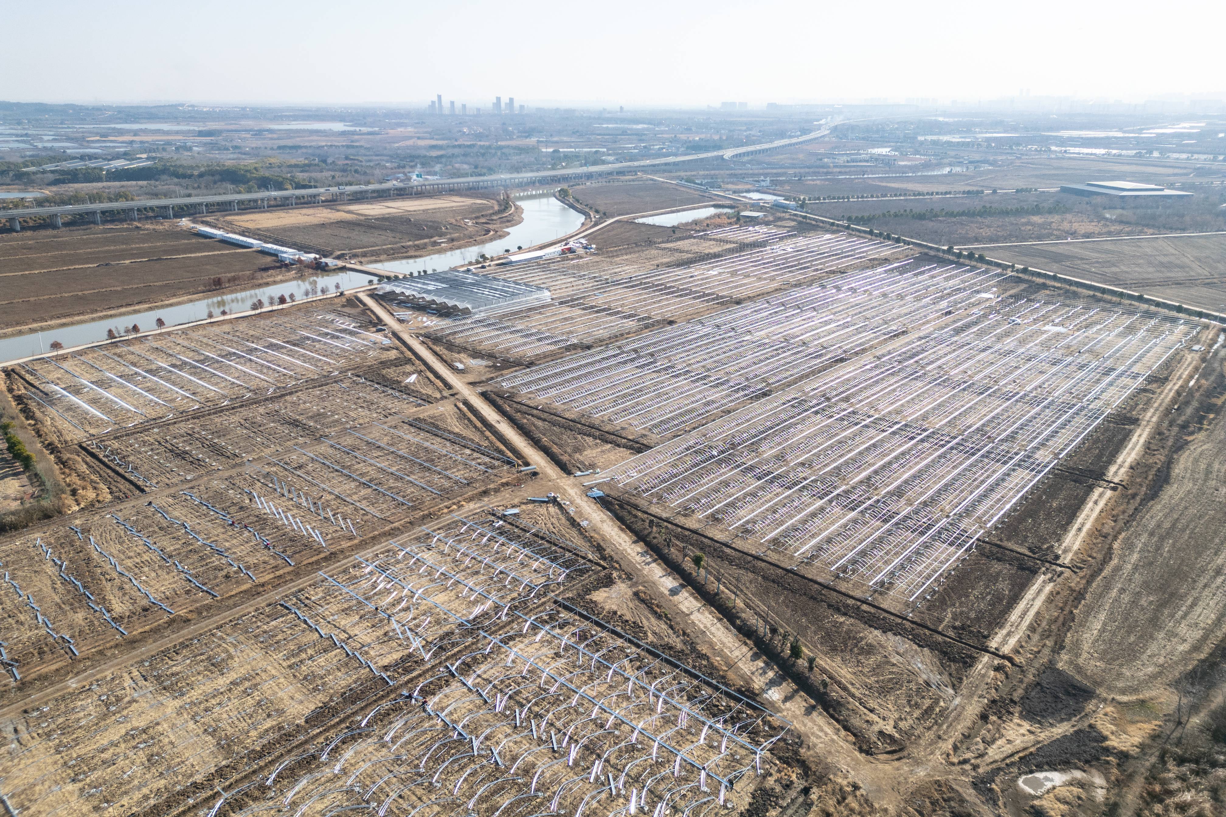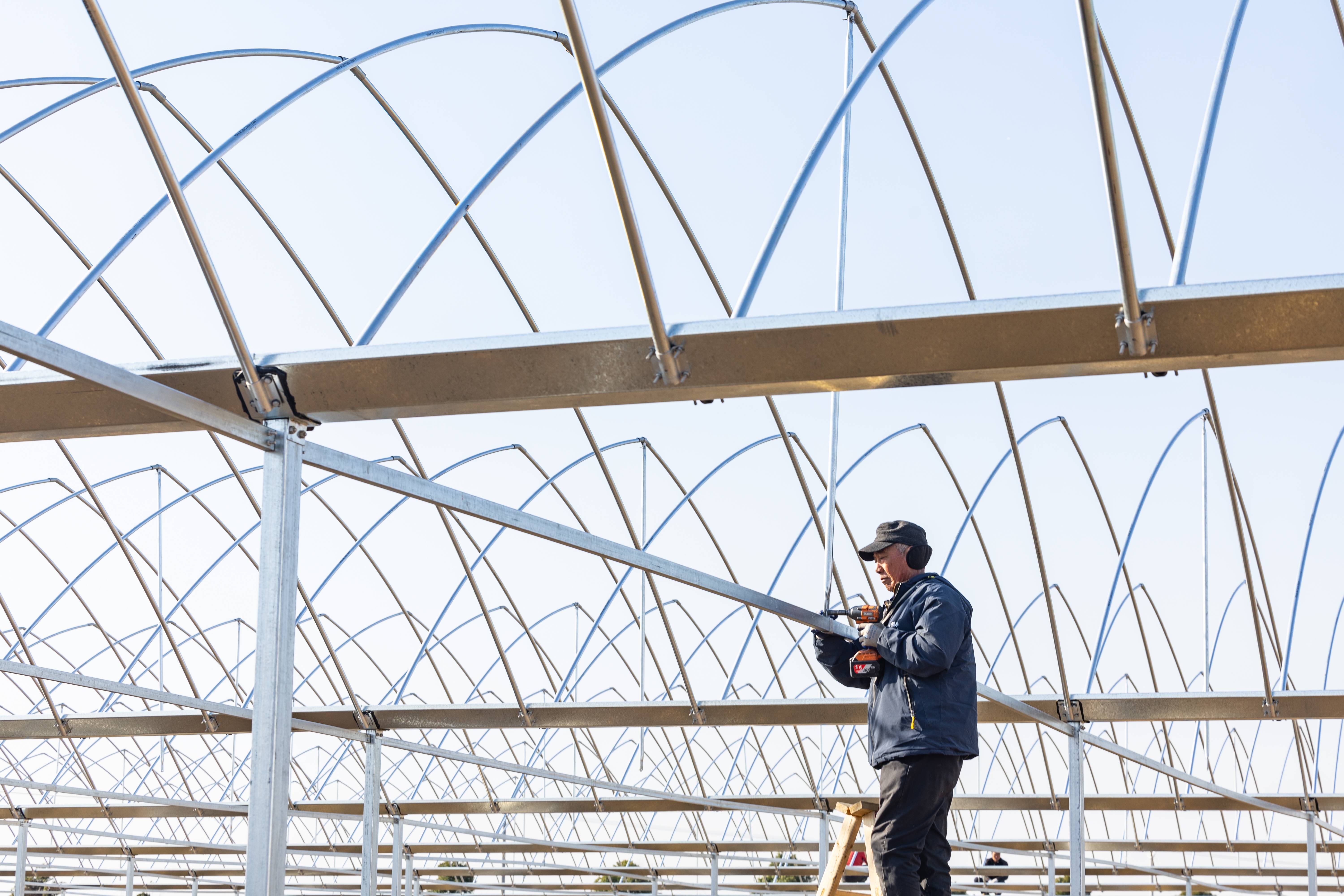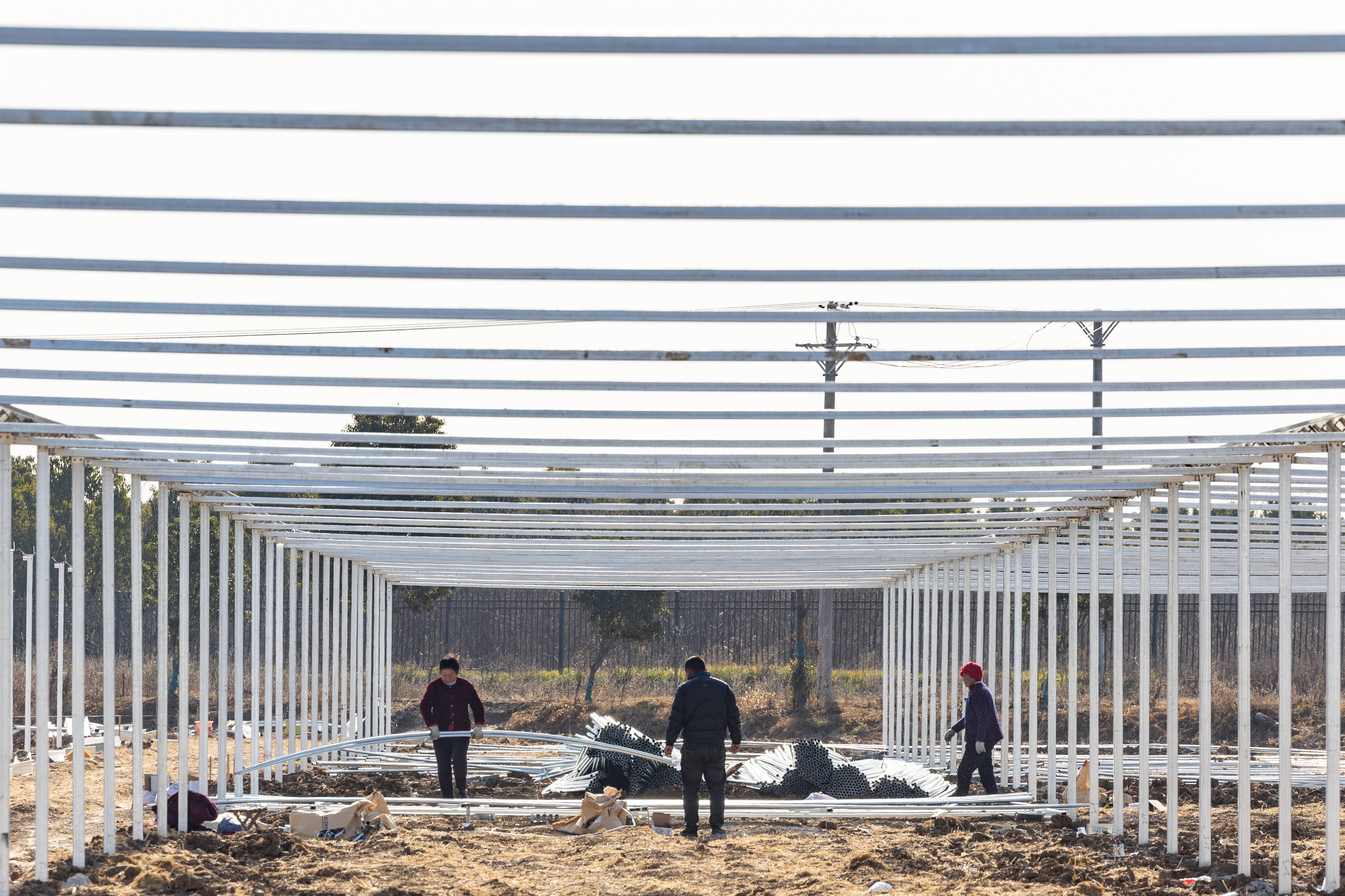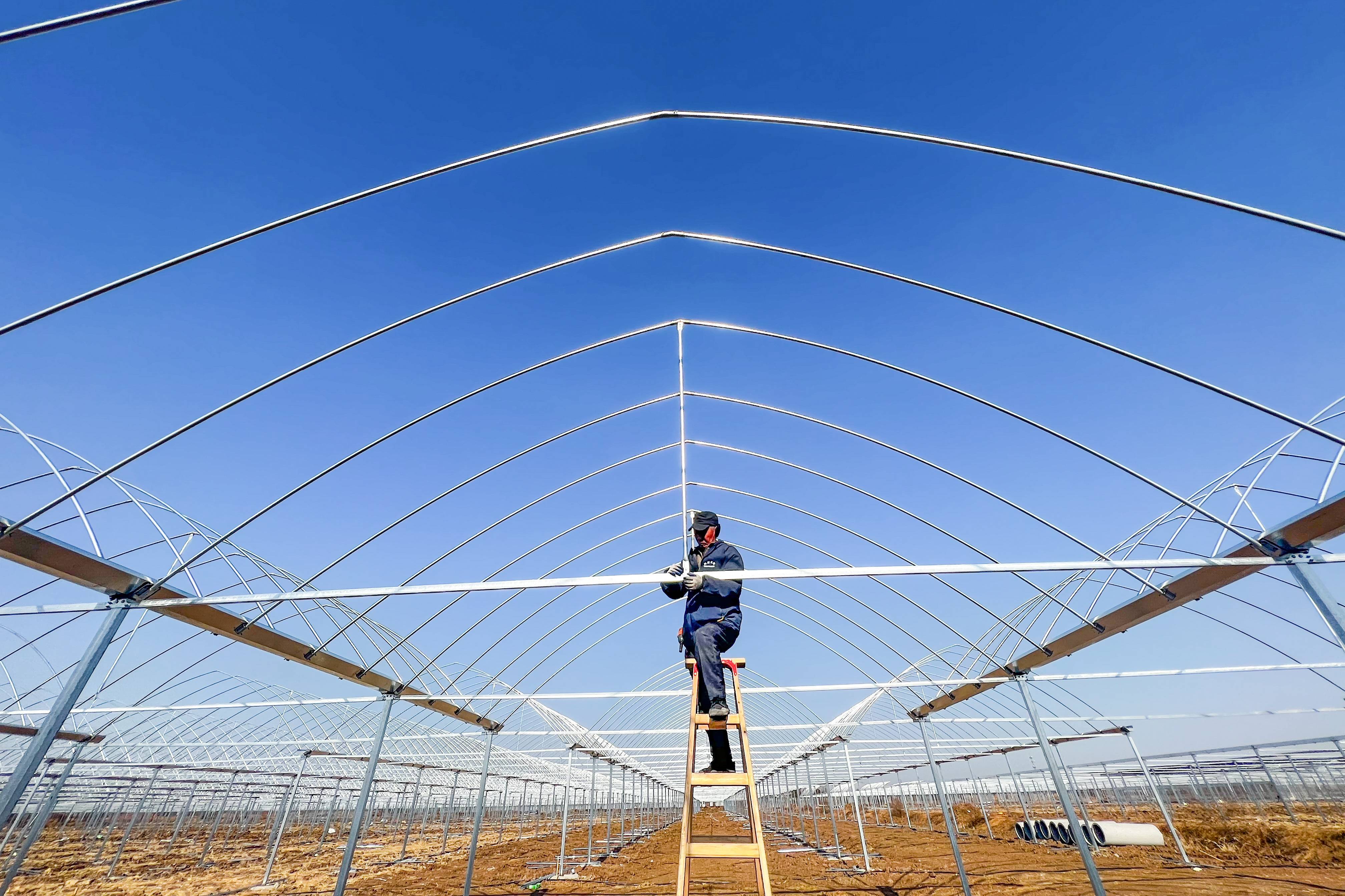 2025年1月15日,在武汉市东西湖区柏泉街武汉阳雀湖农业科技有限公司项目工地上,工人们正在抓紧对大棚进行搭建,春节过后,辣椒炒肉专用椒的幼苗将全部种下去。