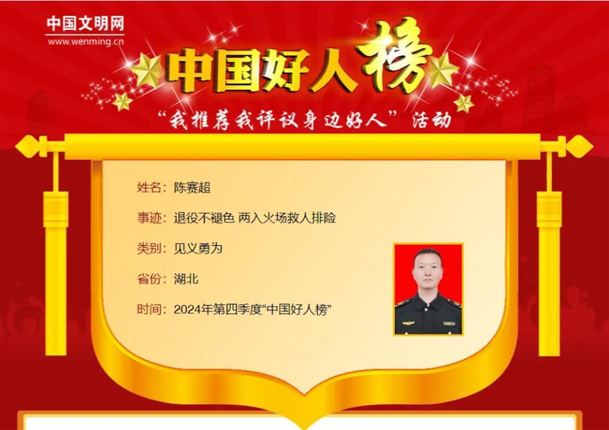 陈赛超是湖北省黄冈市麻城市乘马岗镇综合执法中心工作人员。2024年5月8日18时许,麻城市宋某家因忘关火引发火灾,其丈夫邱某被困。退役消防员陈赛超闻讯即至,指导断电并冒火救人。他打开门窗排烟,勇闯火场救下邱某,随后借桶灭火,发现煤气泄漏,果断关阀并移罐至安全处降温,防止爆炸。陈赛超行动迅速,15分钟内救人灭火,有效阻止了火势蔓延至两侧的榨油厂和宾馆,避免经济损失200余万元。