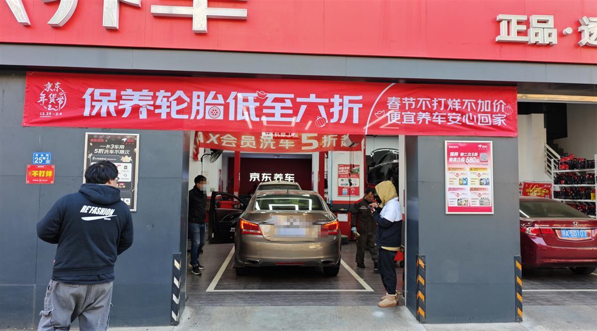 1月15日下午,记者来到京东养车汉阳区百合街店,只见店门前的十来个专用车位已停满,店内还有五六辆车正排队进行保养维修、清洗等作业。“外观清洗仅需19.9元”“春节不打烊不加价”……店门上张挂的春节期间宣传横幅,颇为醒目。