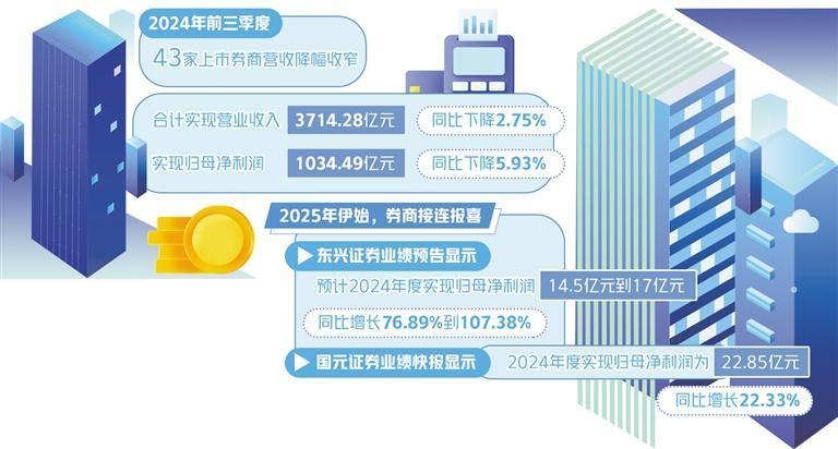 2025年伊始,券商接连报喜。东兴证券业绩预告显示,预计2024年度实现归属于母公司所有者的净利润14.5亿元到17亿元,与上年同期相比,将增加6.3亿元到8.8亿元,同比增长76.89%到107.38%。国元证券业绩快报显示,2024年度实现营业总收入78.39亿元,同比增长23.34%;归母净利润为22.85亿元,同比增长22.33%。