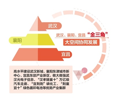 加快推进都市圈联动发展。推进武汉、襄阳、宜昌“金三角”大空间协同发展,高水平建设武汉新城、襄阳东津城市新中心、宜昌东部产业新区,做大做强武汉光电子信息、“汉孝随襄十”万亿级汽车走廊、“宜荆荆”磷化工、“荆襄宜十”绿色循环电池等优势产业集群。
