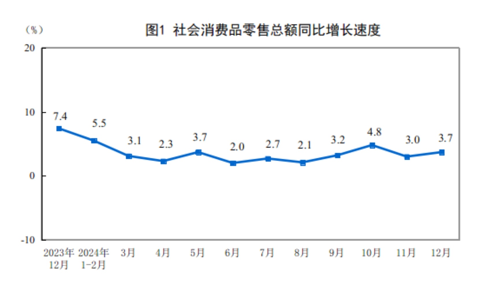 按经营单位所在地分,12月份,城镇消费品零售额38445亿元,同比增长3.7%;乡村消费品零售额6727亿元,增长3.8%。2024年,城镇消费品零售额421166亿元,比上年增长3.4%;乡村消费品零售额66729亿元,增长4.3%。