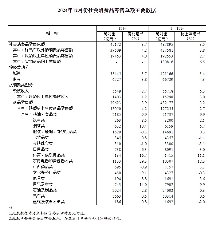 中新网1月17日电 据国家统计局网站消息,12月份,社会消费品零售总额45172亿元,同比增长3.7%。其中,除汽车以外的消费品零售额39509亿元,增长4.2%。2024年,社会消费品零售总额487895亿元,比上年增长3.5%。其中,除汽车以外的消费品零售额437581亿元,增长3.8%。