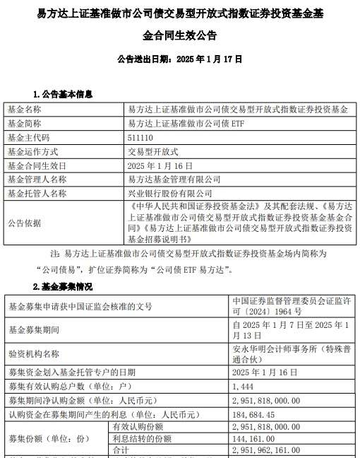 中国经济网北京1月17日讯 今日,易方达基金管理有限公司发布易方达上证基准做市公司债交易型开放式指数证券投资基金基金合同生效公告。