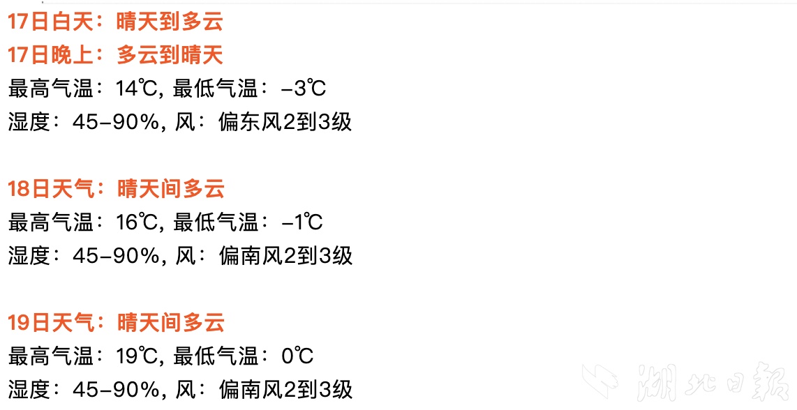 昨天武汉市艳阳高照,最高气温大部地区12℃~15℃,最低气温中心城区2℃~4℃、其他大部-3℃~1℃。今天是“四九”第一天,早晨武汉市晴朗开场,最低气温中心城区1℃~4℃,其他大部-5~0℃。