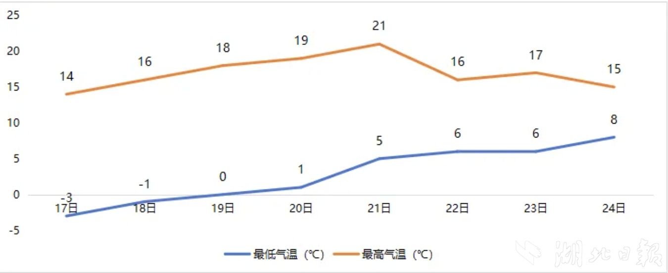 湖北日报讯(记者汤炜玮、通讯员陈声超)1月17日从武汉市气象局获悉,预计未来一周,武汉市降水偏少,昼夜温差大,火险等级高。21日前气温回暖明显,最高气温也将来到21℃,22日起有冷空气活动,24日有降水发展。