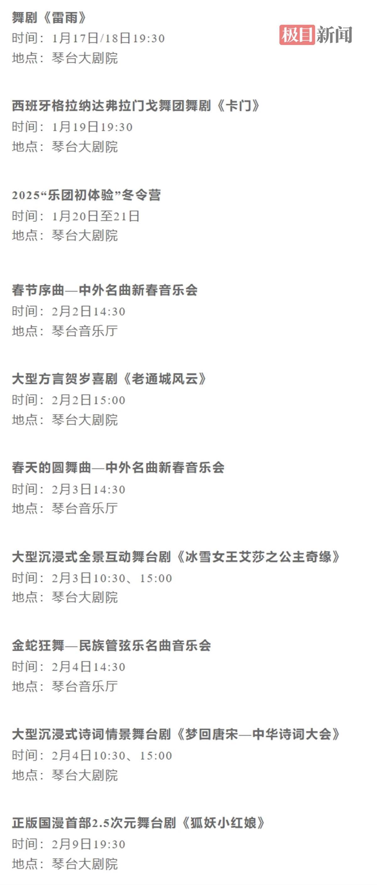 汉阳区文旅局相关负责人在会上表示,汉阳琴台中央文化艺术区作为全市文化艺术高地,2025年春节期间将持续推出几十场不同类型的演出,满足各个年龄层次需求,琴台音乐厅将集中奉献多场高品质且内容丰富的音乐会,包括春节序曲—中外名曲新春音乐会、春天的圆舞曲—中外名曲新春音乐会、金蛇狂舞—民族管弦乐名曲音乐会等多场高品质音乐表演。琴台大剧院安排了舞剧《雷雨》、话剧《皮囊》、杨丽萍导演作品舞台剧《平潭映象》、大型方言贺岁喜剧《老通城风云》、大型沉浸式全景互动舞台剧《冰雪女王艾莎之公主奇缘》、大型沉浸式诗词情景舞台剧《梦回唐宋——中华诗词大会》和正版国漫首部2.5次元舞台剧《狐妖小红娘》等各类型精彩剧目。