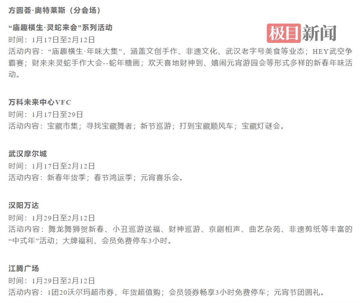 武汉中心城区首座奥莱MALL——方圆荟奥特莱斯将推出以“趣奥莱,当红不让!”为主题的系列促销活动,将举办“庙趣横生·年味大集”、HEY武空争霸赛、灵蛇纳福游园会和手作大会活动,在大众点评、美团APP还将会有新春超值团券可以抢购。万科未来中心VFC、武汉摩尔城、汉阳万达广场、江腾广场等商业体均有新春优惠活动推出。