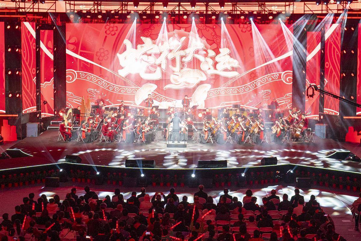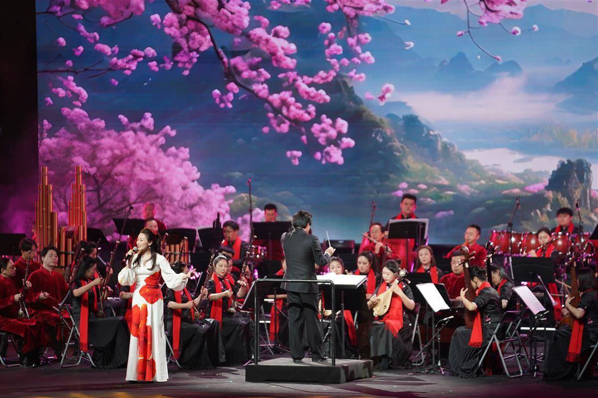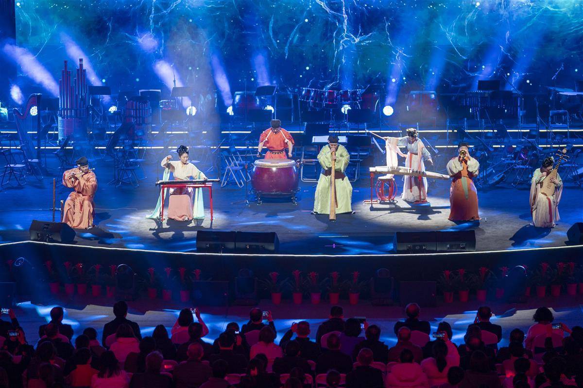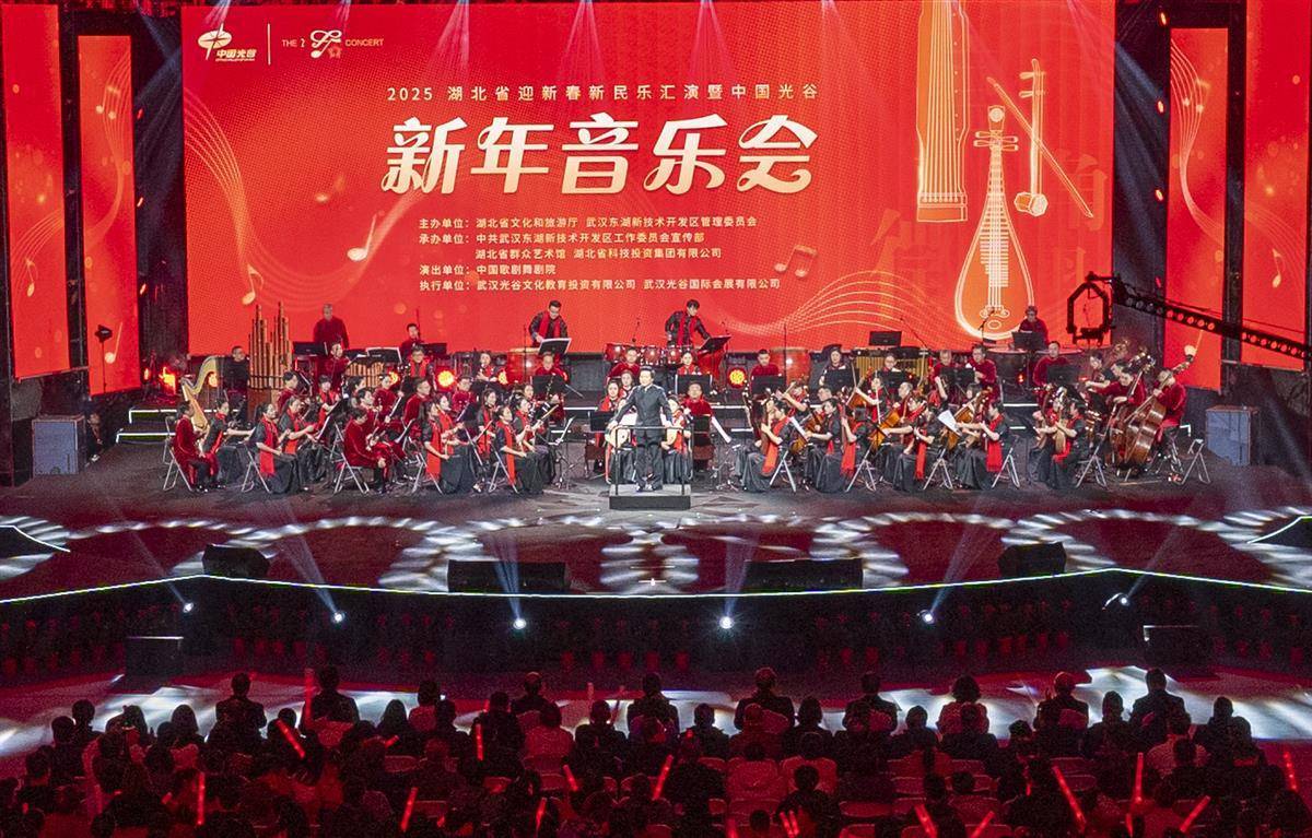 1月17日晚,2025湖北省迎新春新民乐汇演暨中国光谷新年音乐会,在光谷国际网球中心中央球场举行。音乐会通过探索经典民乐与人工智能技术融合,呈现中国传统音乐与人工智能技术的奇妙相遇。中国歌剧舞剧院民乐团现场演绎《射雕英雄传》《西游记》《小刀会序曲》等经典影视主题曲。在央视火爆出圈的神仙乐团——上海自得琴社也登台表演,他们或抚琴、吹箫,或击打鼓,为大家再现了一场“天上乐、画中仙”的唐风盛宴。