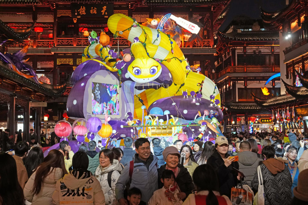 2025年1月1日,人们在生肖蛇年主题灯组前留影。新华社记者 刘颖 摄
