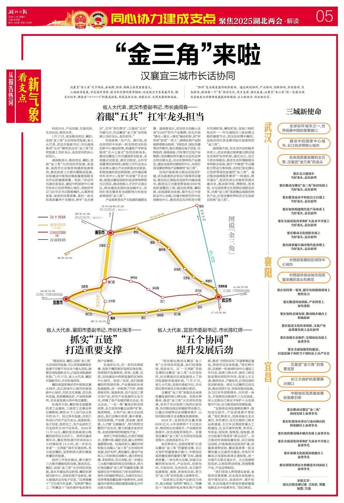 “报告提出推进汉襄宜‘金三角’大空间协同发展,我们倍感振奋、倍添动力。从‘一主两副’多极支撑到汉襄宜‘金三角’大空间协同,标志着湖北区域发展进入了协同发展新的更高阶段。”1月17日,省人大代表,宜昌市委副书记、市长陈红辉对湖北日报全媒记者说。