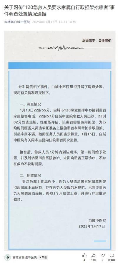1月17日,吉林省白城中医院针对此事发布通报称,院方组织开展了调查处置,不存在救治不及时问题,已将涉事医务人员调离原岗位,停发3个月绩效工资,并进行严肃批评教育。(据1月17日鲁中晨报)