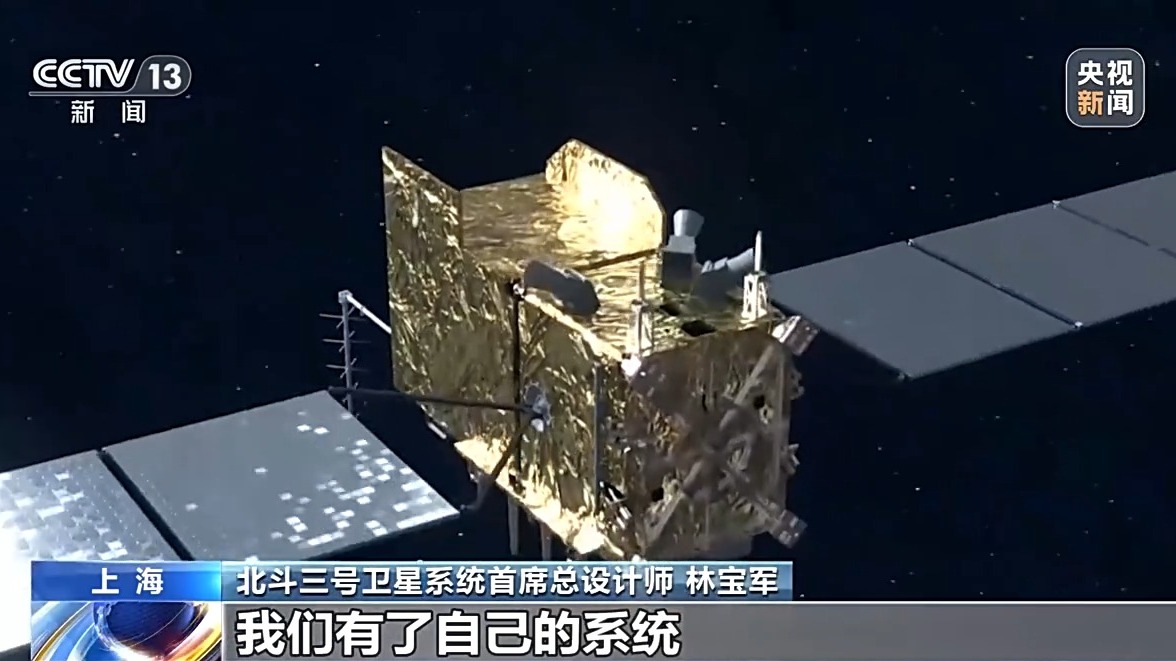 北斗三号卫星系统首席总设计师 林宝军:正是有了这些创新,我们有了自己的系统,我们再不受制于人。北斗系统已经用到了200多个国家,现在产值也已经到了5000多个亿,所以说正是在航天高科技上,我们努力去攻关,抢占制高点,才有我们今天的北斗。