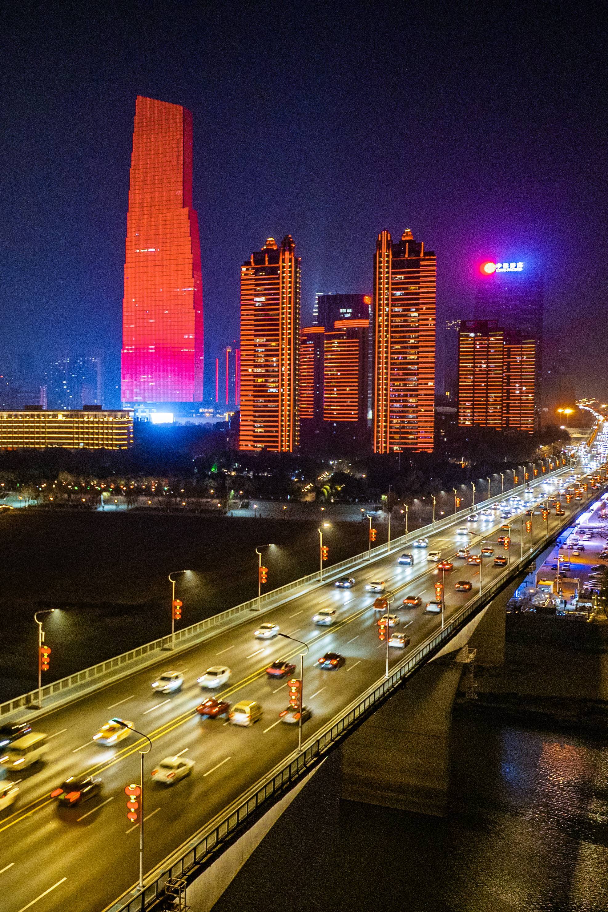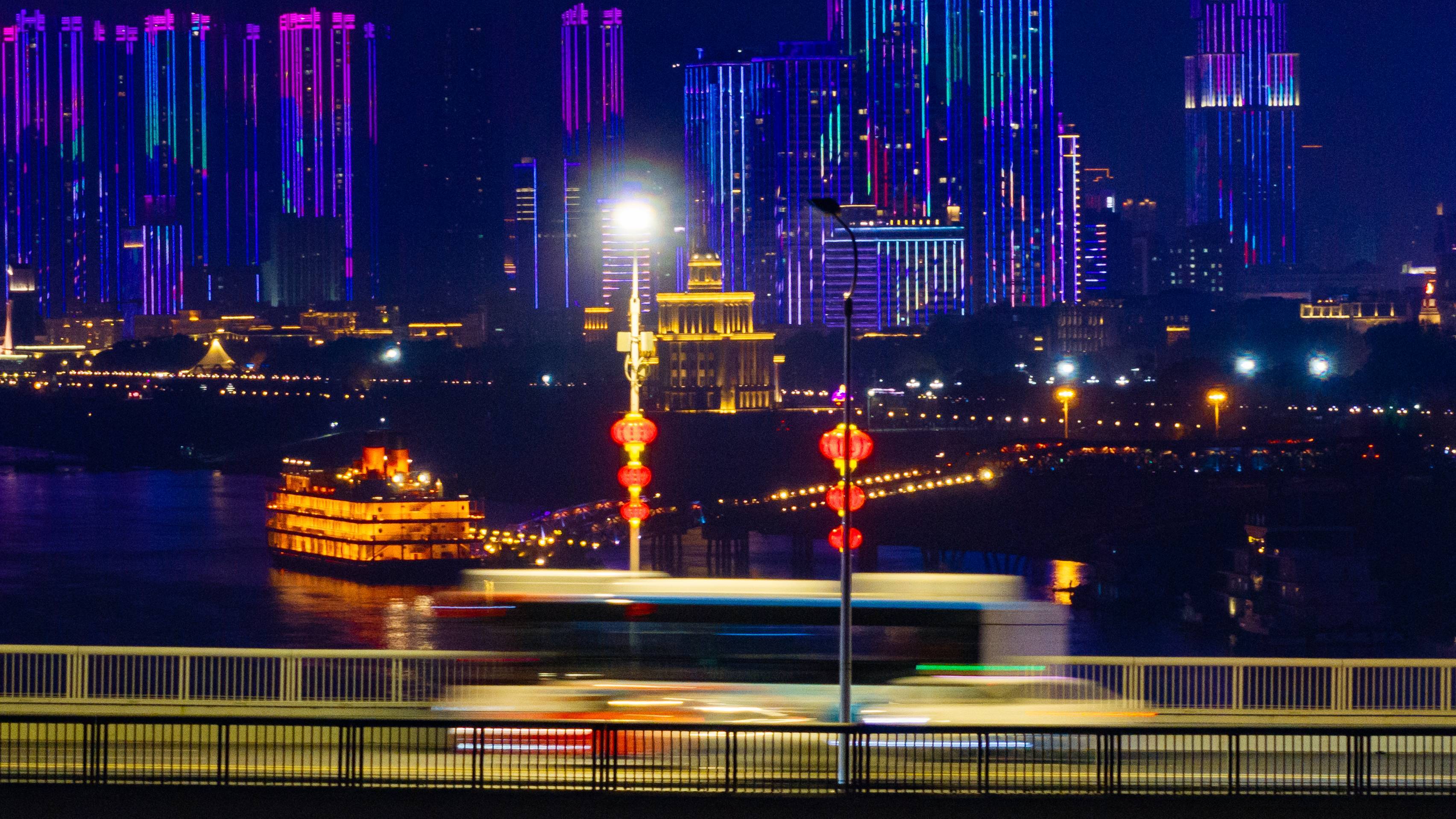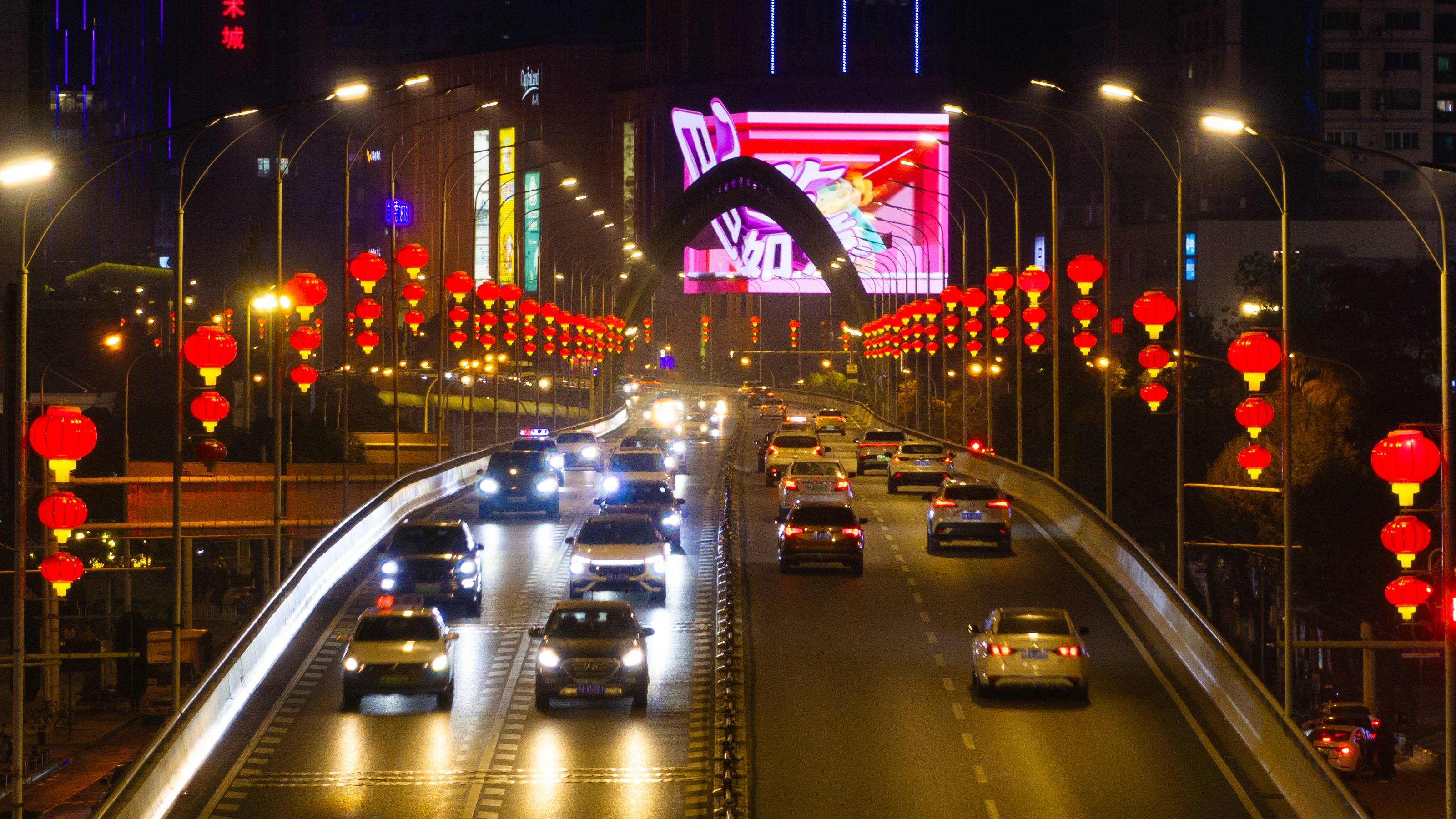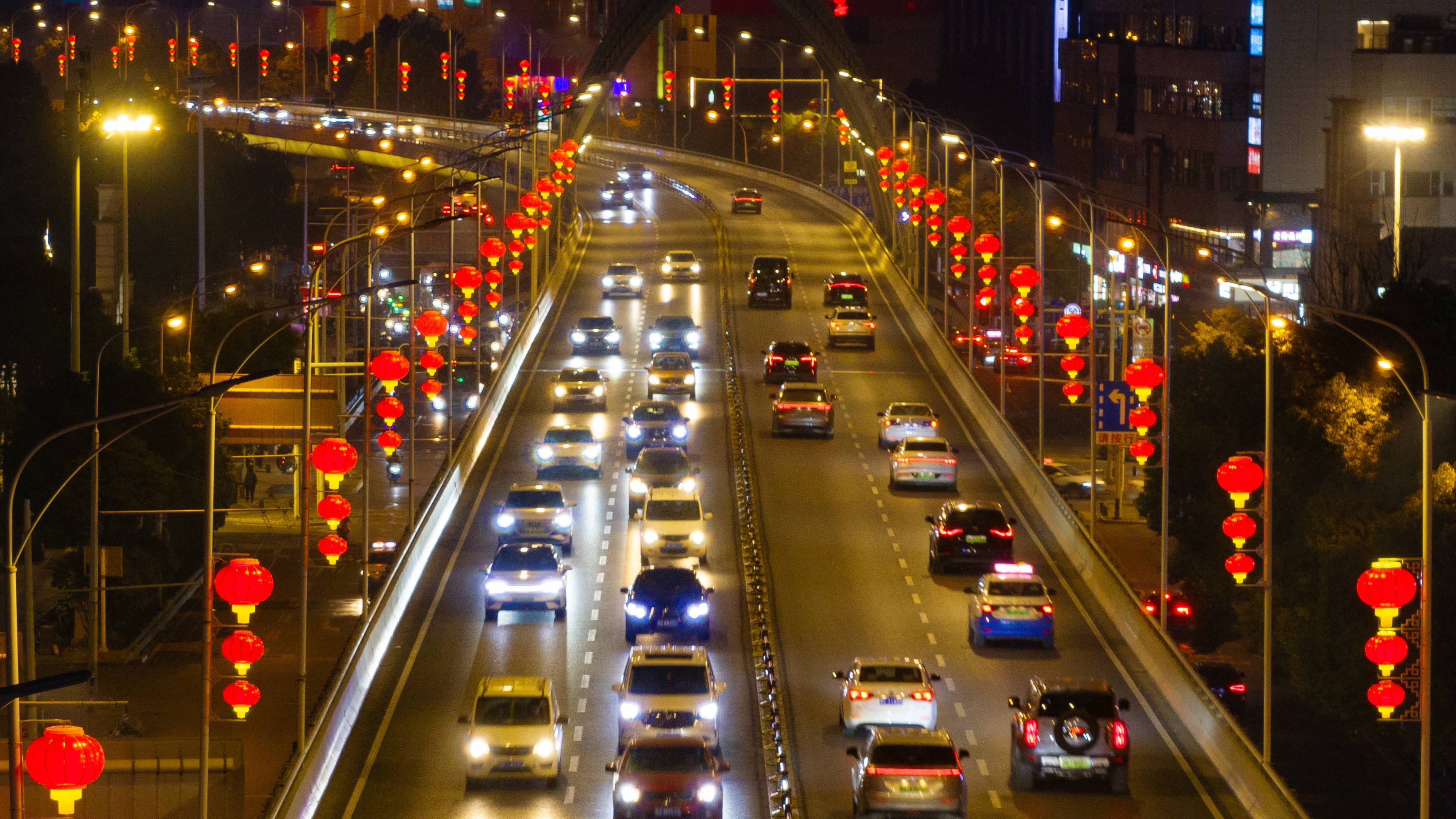 2025年1月18日晚,武汉中北路高架上灯笼高挂,年味浓浓。(湖北日报全媒记者 何宇欣 摄)