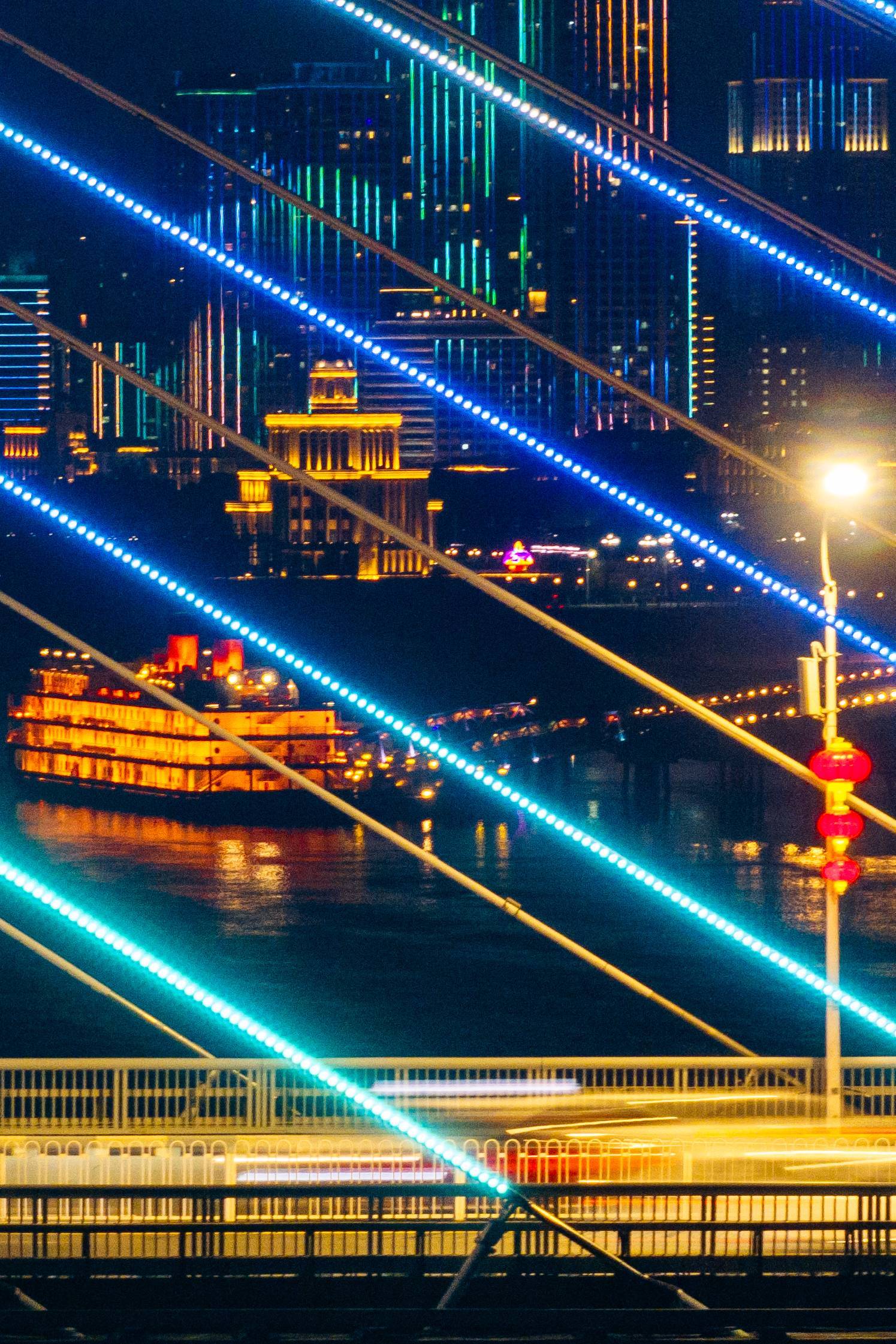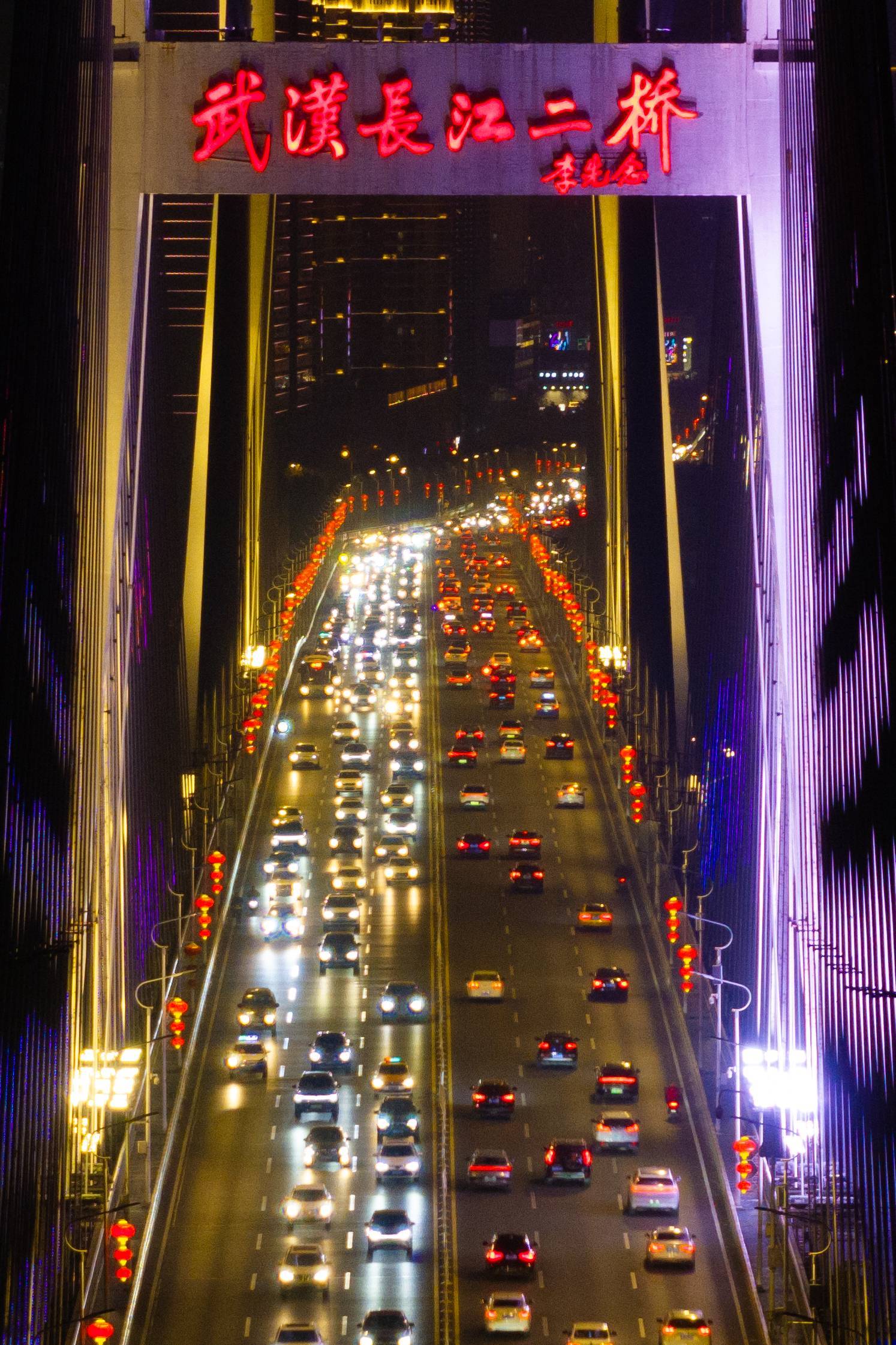 2025年1月18日晚,武汉长江二桥上灯笼高挂,流光溢彩,年味浓浓。(湖北日报全媒记者 何宇欣 摄)