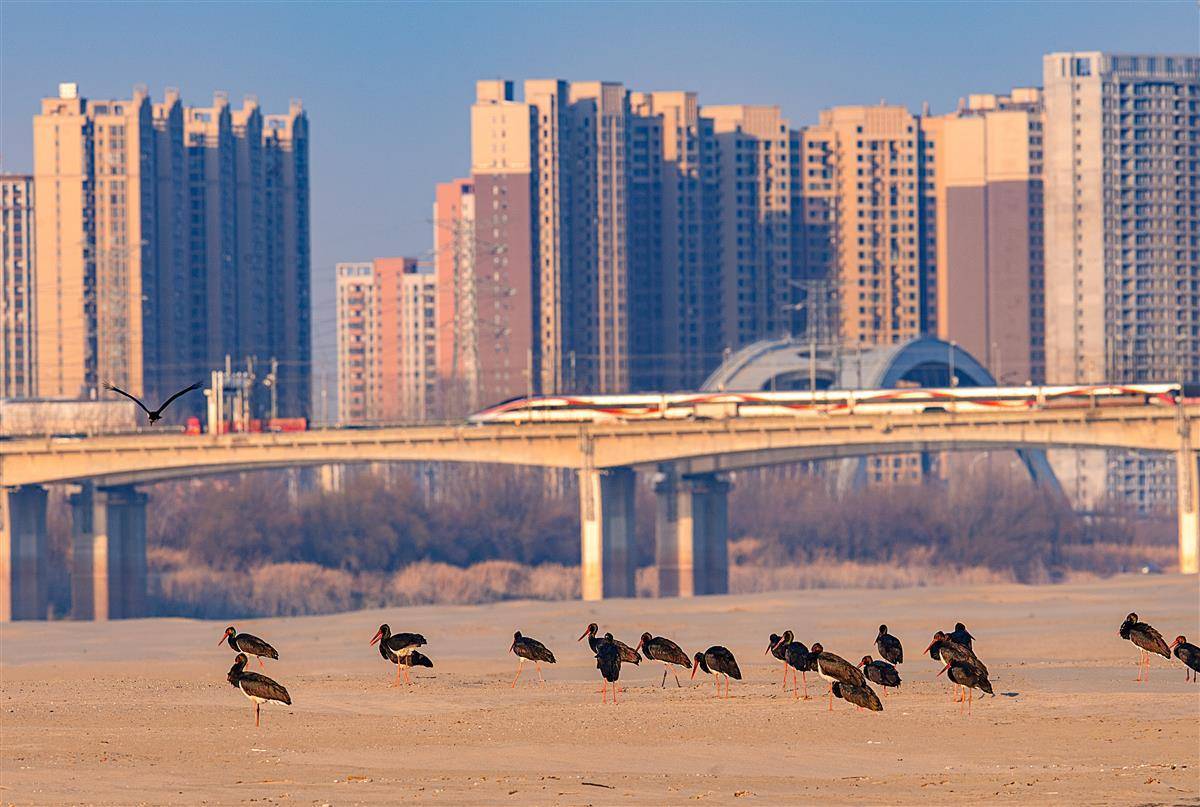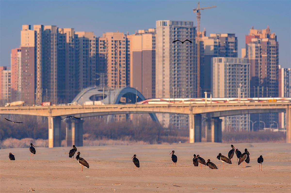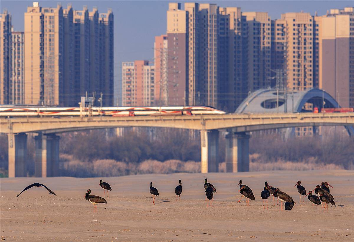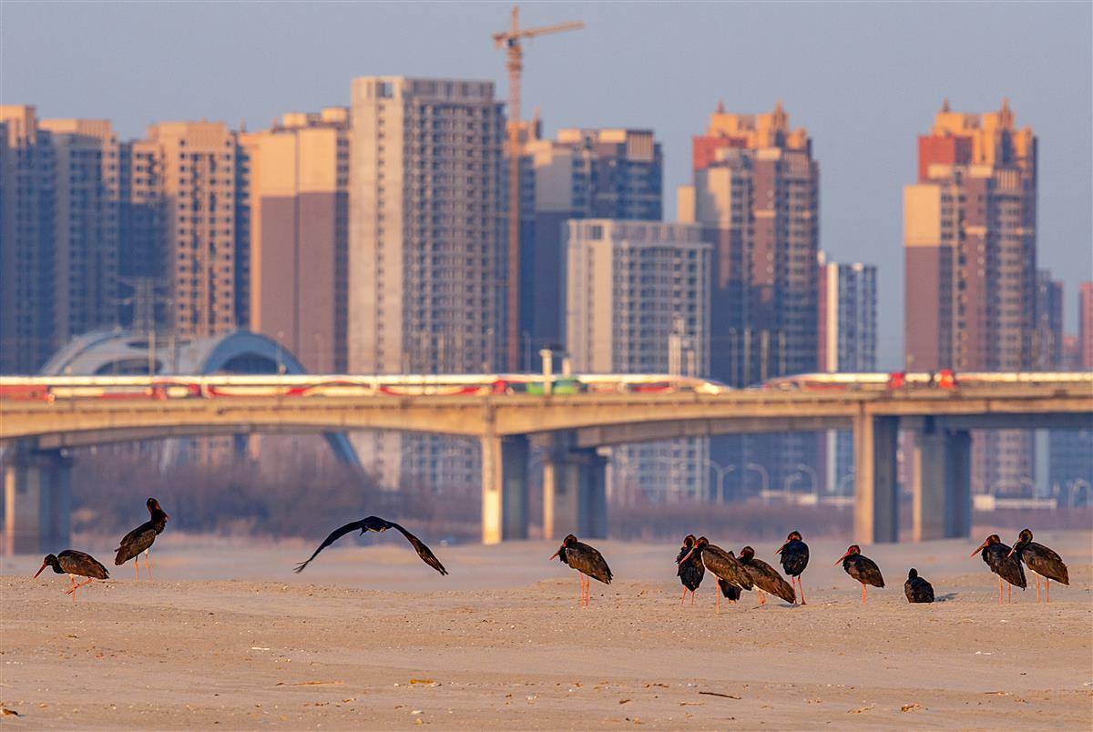 1月15日下午,成群的黑鹳在武汉天兴洲洲头沙滩上安静地晒太阳,时而高亢时而低沉的鸟鸣声、天兴洲长江大桥上高铁列车疾驰而过声、远处城市的喧嚣声,汇成人与自然界的最美“和声”。
