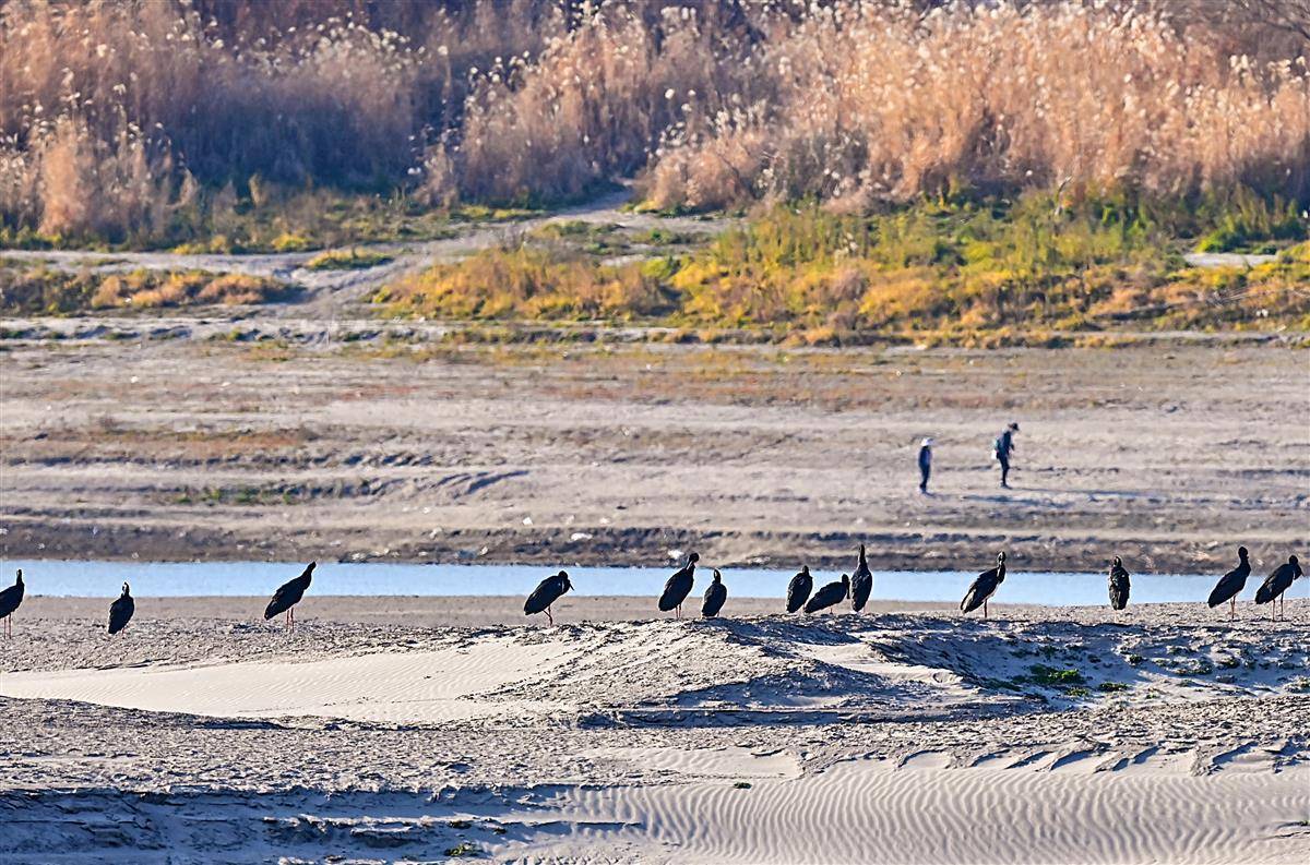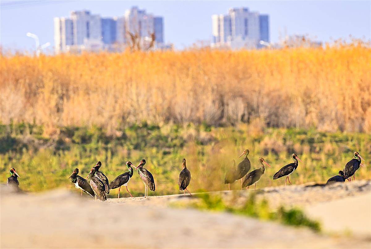 天兴洲地处武汉三镇腹地,长江江心,是城市的生态“绿心”。黑鹳是国家一级重点保护野生鸟类,因数量稀少,素有“鸟中大熊猫”之称。2014年至今,黑鹳已连续11年飞临天兴洲过冬。从北方长途迁徙南下越冬,天兴洲被黑鹳选为越冬家园,充分显现了长江大保护的卓越成效,展现了人与自然和谐共生的美好图景。