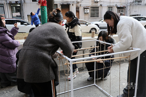 志愿者合力搭建猫窝攀爬架。 通讯员供图