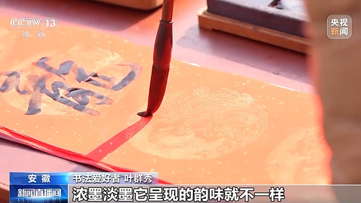 书法爱好者 叶群秀:写书法必须要用到墨,墨不光是必需的材料,也是中国书法一个组成部分,浓墨淡墨它呈现的韵味就不一样。一个润,二个它没有很大的阻力,它落在纸上它可以透进去。