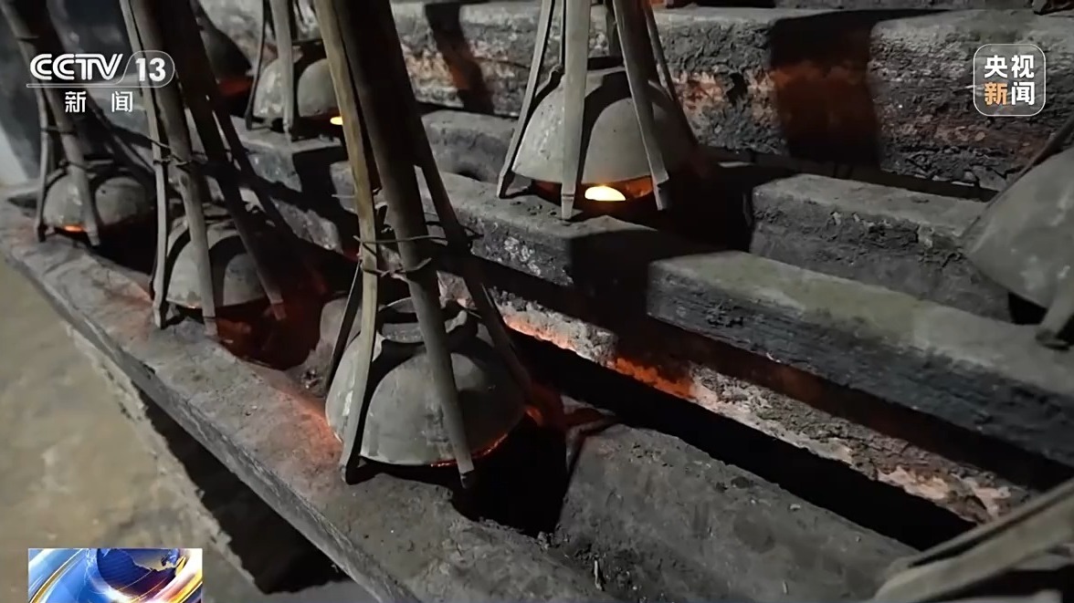徽墨制作技艺省级传承人 程国胜:这是其中之一叫古法点烟,它的主要原材料是用桐油和猪油,把这两种原材料搅拌在一起,通过灯芯草通过小火点燃,因为缺氧会产生大量的烟,烟上升到碗的顶部,把烟灰刷下来以后,这就是做墨的最初原材料。通过无数次的这样地去收集以后,才可以去做墨。