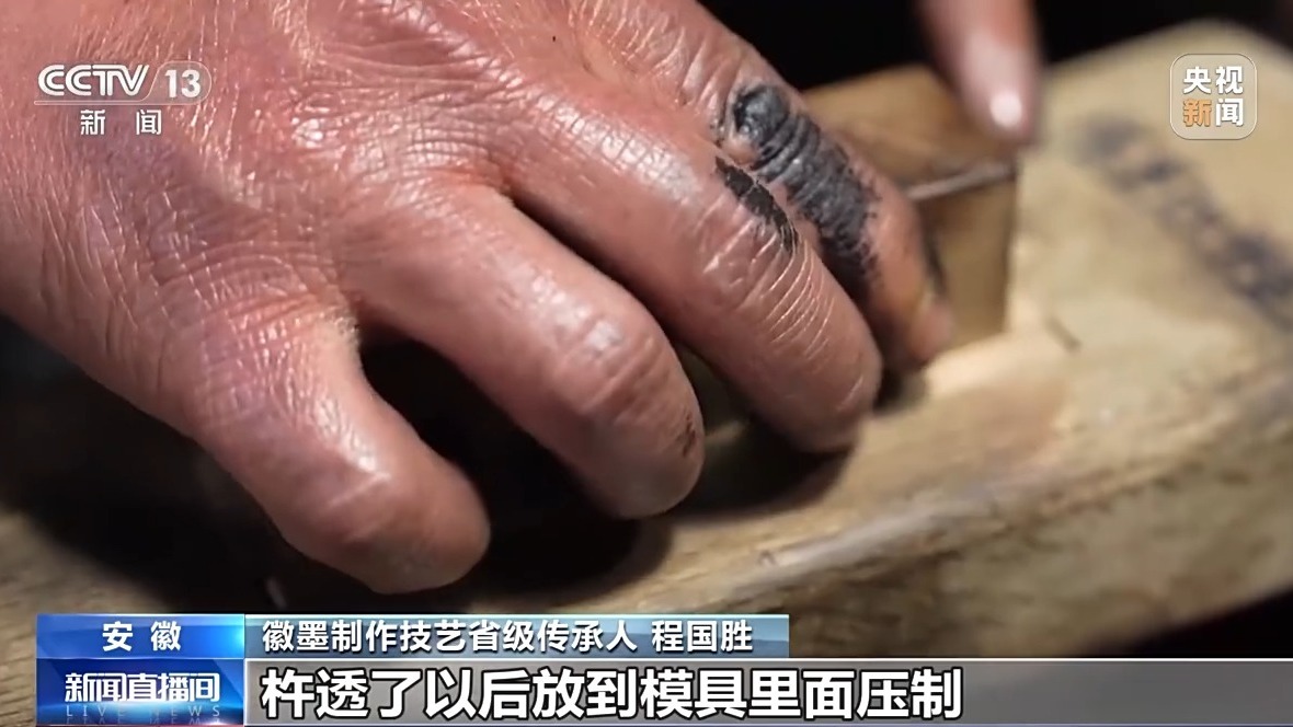 徽墨制作技艺省级传承人 程国胜:我们的师傅经过轻胶10万杵来杵,就像一个捶打的过程当中,杵透了以后放到模具里面压制过以后,它才会送到下一个车间进行阴干。