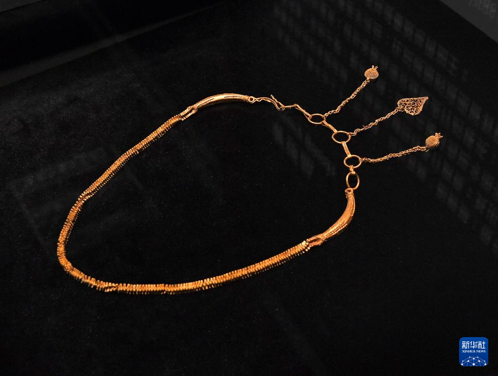 这是“从湾区启航:‘南海一号’与海上丝绸之路”展览上展出的金单顶链犀角形锥筒饰项链(2024年11月28日摄)。新华社记者 陈铎摄