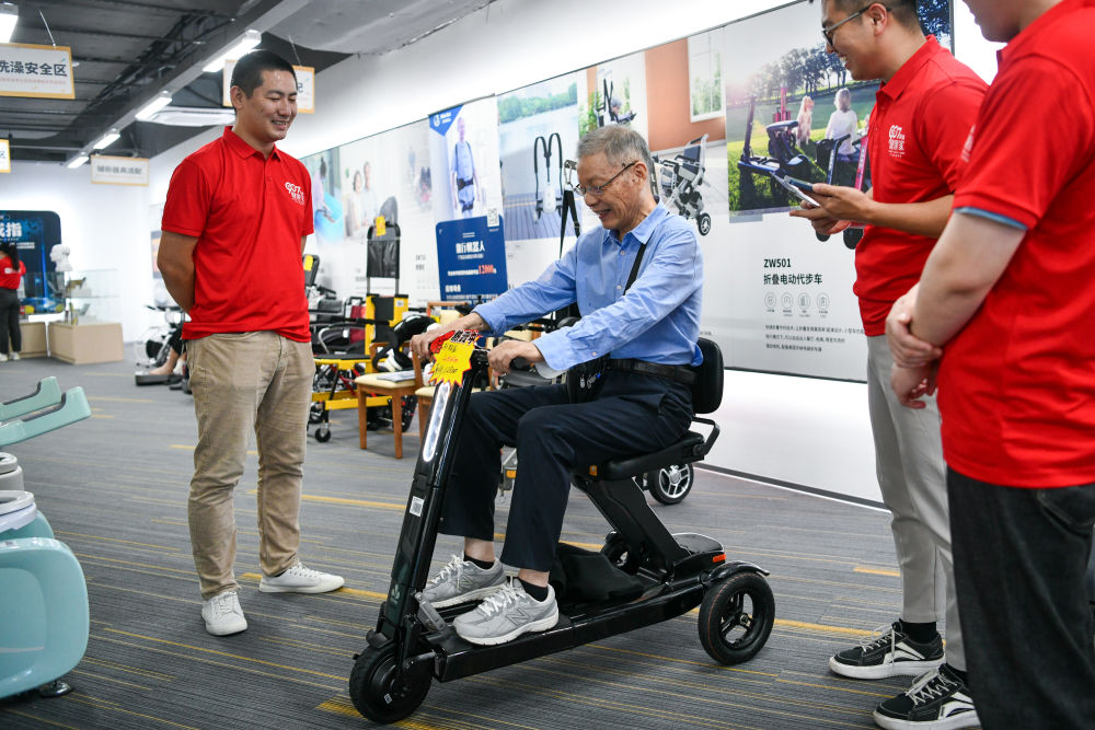 2024年10月12日,一名老人在体验折叠电动代步车。位于深圳的老年用品商场“深业·健康汇”向市民开放,展示居家安全、娱乐生活、智能照护等50余个品类、数百种智能居家适老产品,吸引众多市民前来了解、选购。新华社记者梁旭 摄