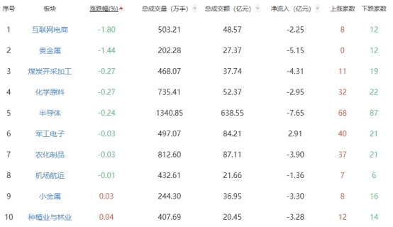 板块方面,影视院线、电网设备、电池等板块涨幅居前,互联网电商、贵金属、煤炭开采加工等板块跌幅居前。
