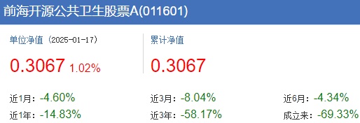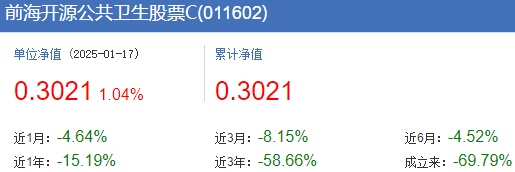 中国经济网北京1月20日讯 2024年全年,前海开源公共卫生股票基金A/C分别以-20.83%、-21.13%的收益率收官。不仅如此,该基金自2021年3月25日成立之后就持续下跌,截止到2025年1月17日的累计收益率跌幅高达69.33%、69.79%,累计净值分别为0.3067元、0.3021元。