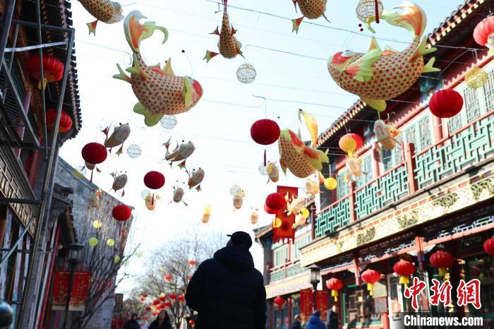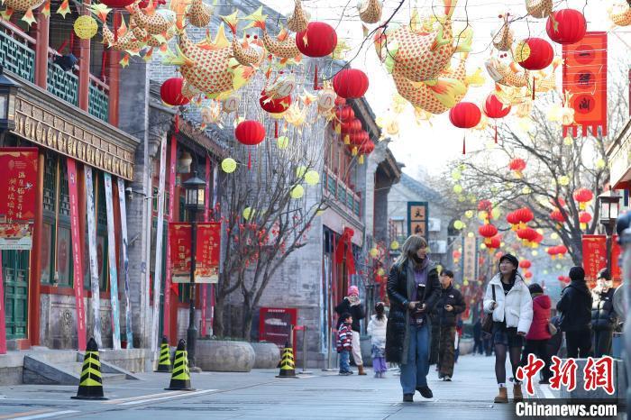 1月20日,北京,游客打卡琉璃厂文化街的新春装饰。春节临近,琉璃厂文化街装点各式新春装饰,年味渐浓。中新社记者 王紫儒 摄