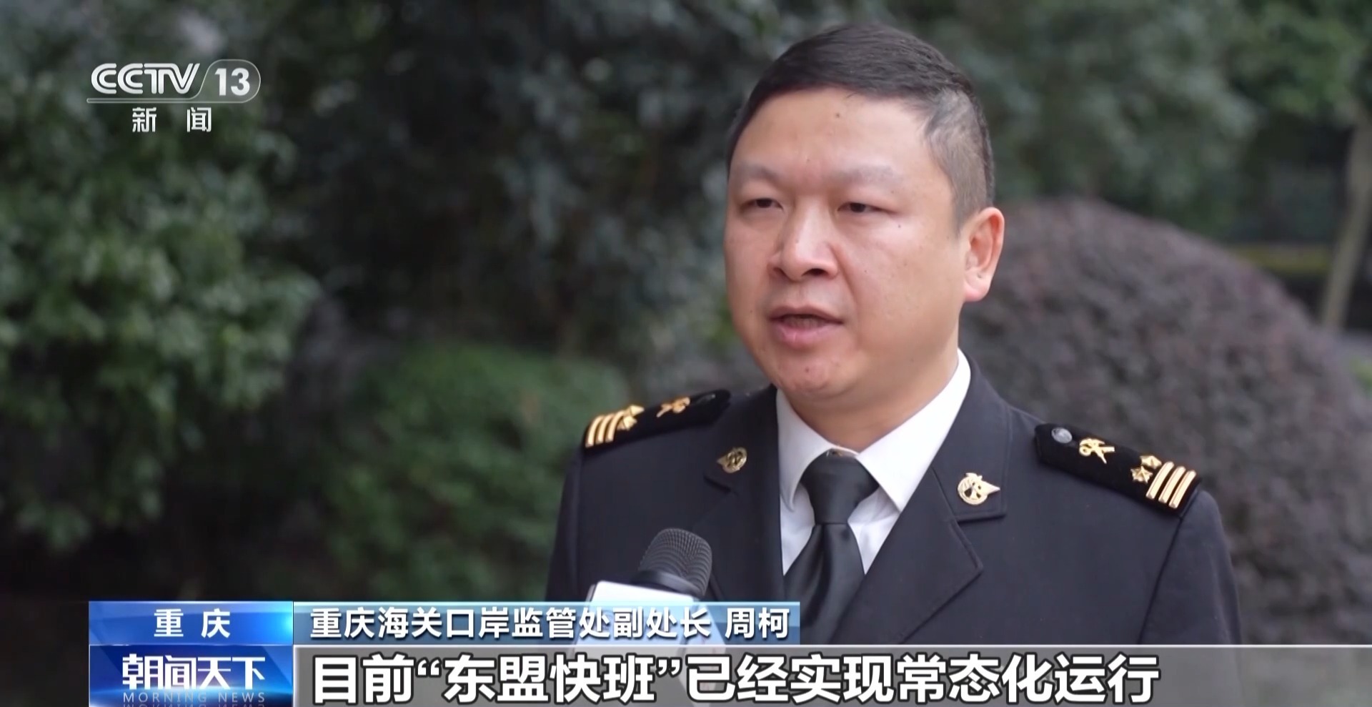 重庆海关口岸监管处副处长 周柯:目前“东盟快班”已经实现常态化运行,企业只需一次委托、一次付费,一次下单,就可以实现集装箱的“一箱到底”运输,比传统运输方式可节约5-10天。