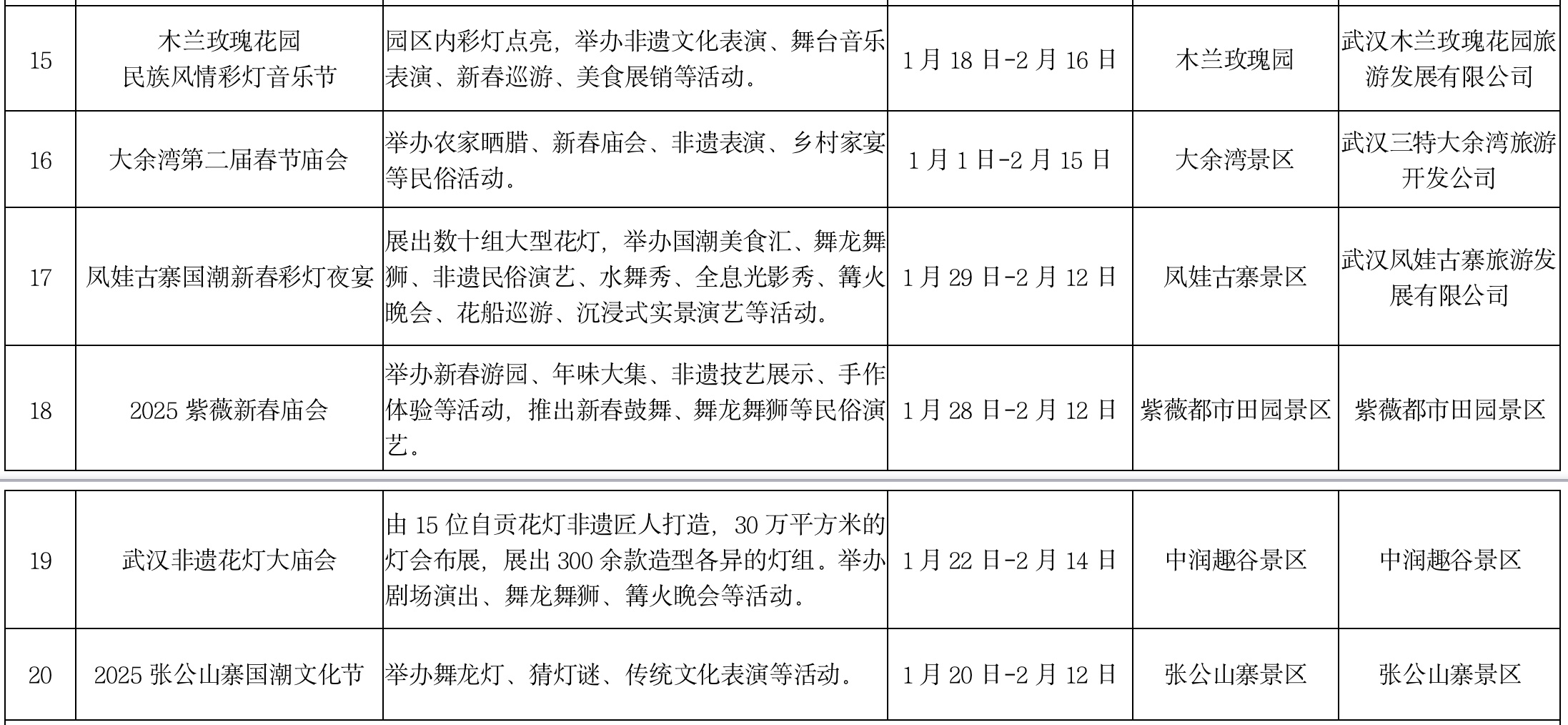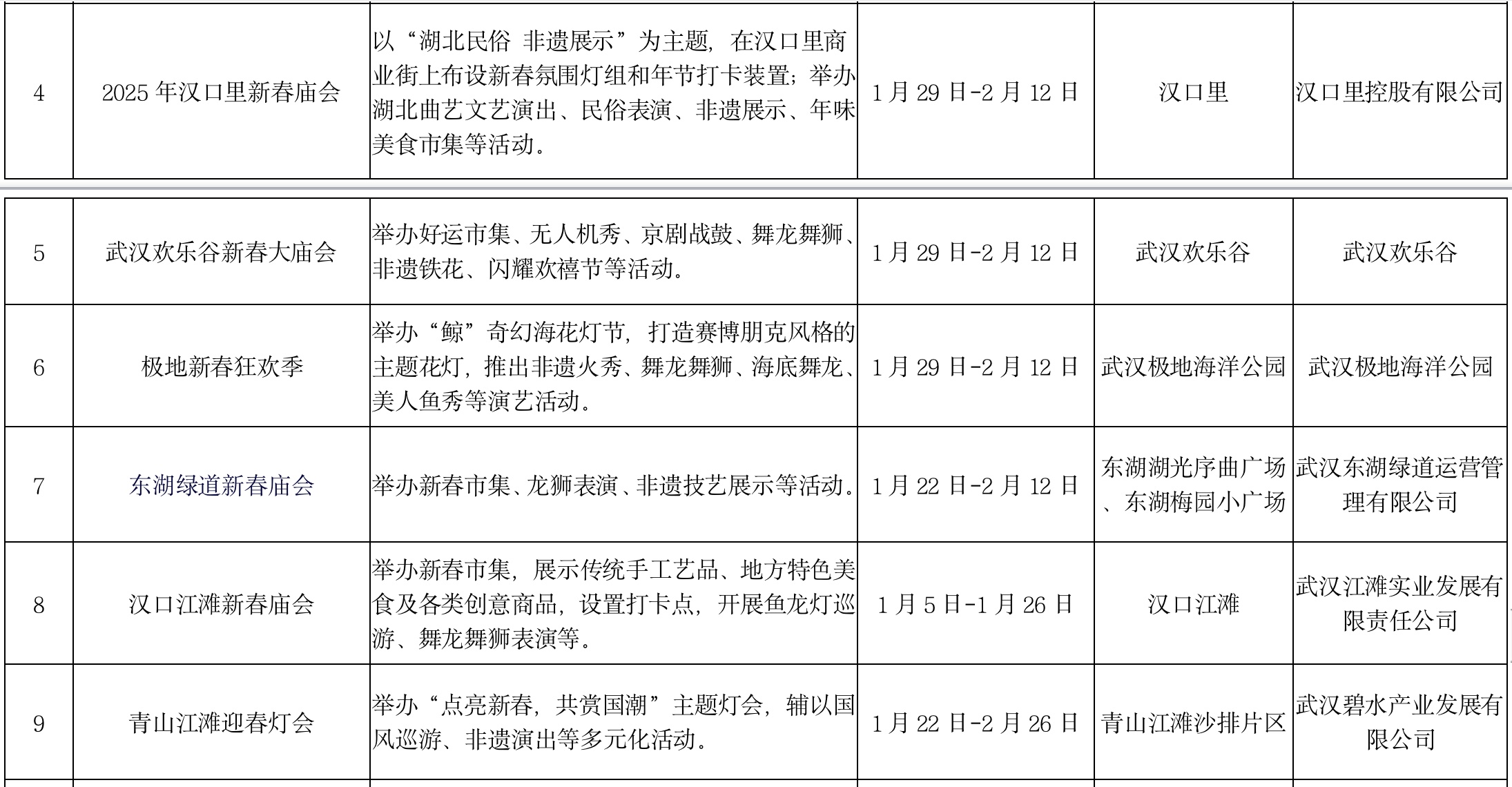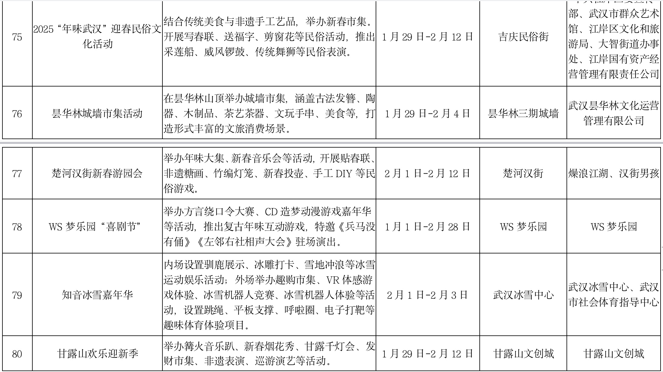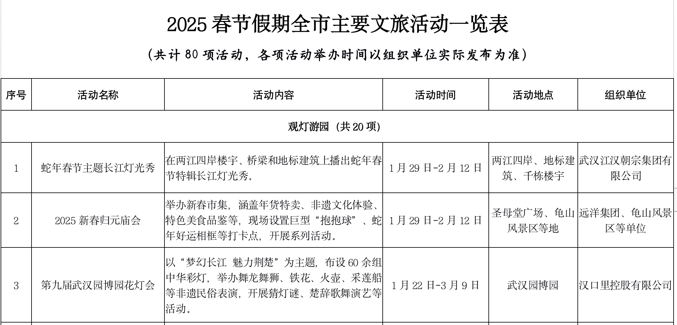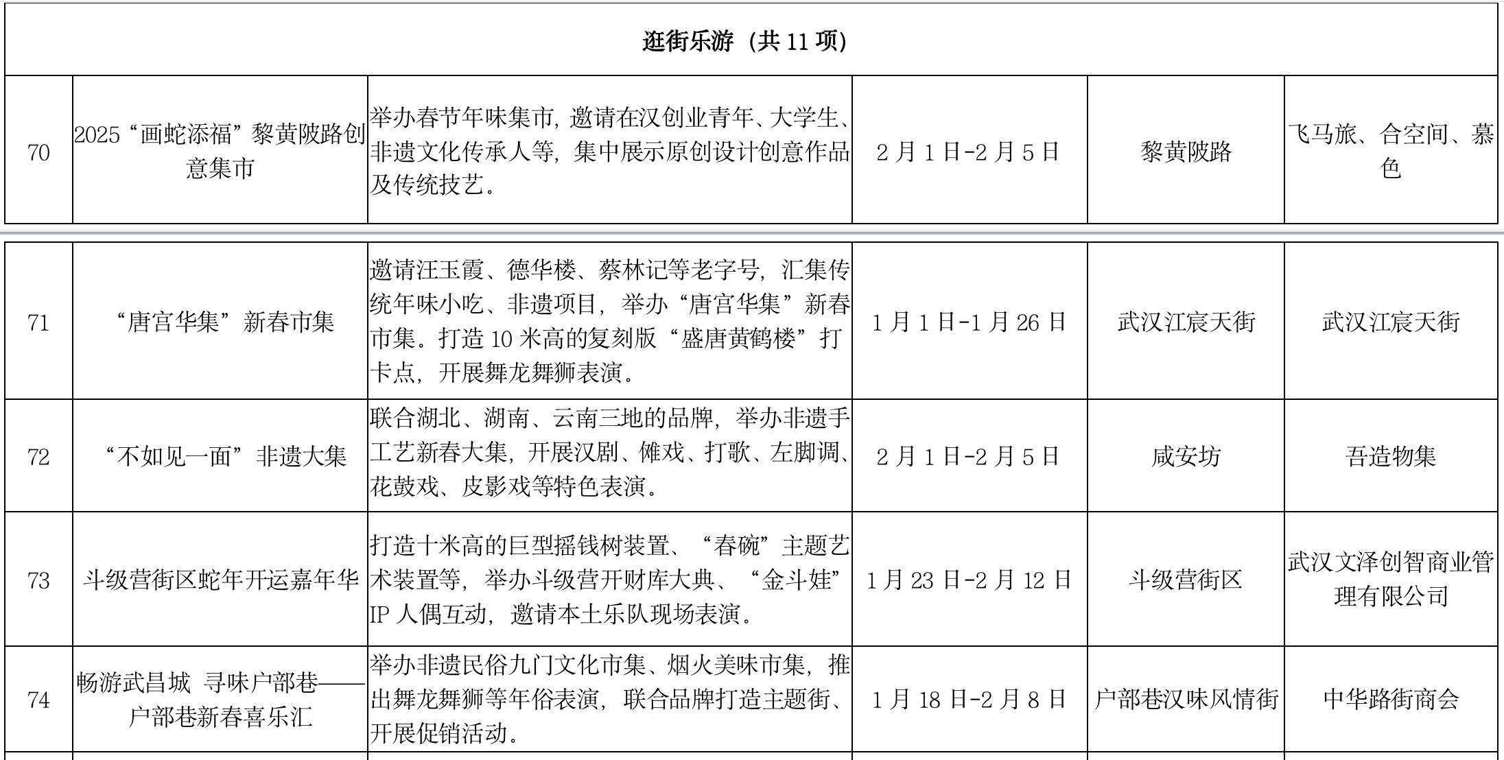 “巳巳如意游武汉”板块。主要包括四大类80项活动:一是观灯游园。举办各类新春庙会、游园灯会、民俗市集等活动。主要包括2025新春归元庙会、武汉园博园“梦幻长江 魅力荆楚”主题灯会、汉口里街区“湖北民俗 非遗展示”新春庙会、花博汇“花火富贵年”新春系列活动。邀请非遗传承人现场展示传统技艺,举办舞龙舞狮、铁花火壶、国潮巡游等民俗体验活动。