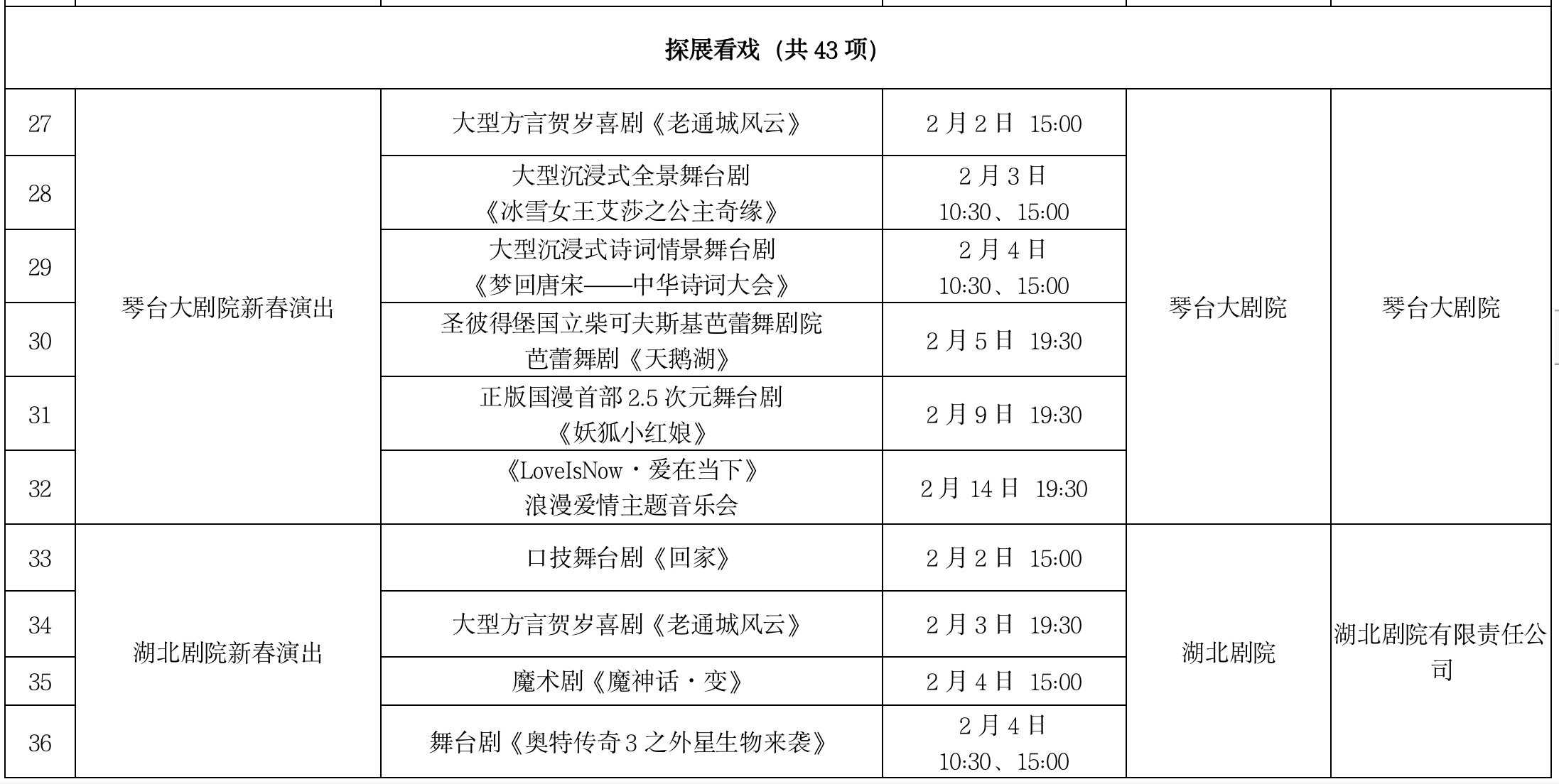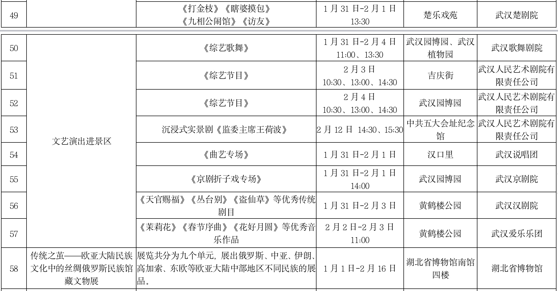 三是探展看戏。举办各类新春演出、主题展览活动。开展“文艺演出进景区”系列活动。在中共五大会址纪念馆、园博园、吉庆街上演沉浸式实景剧《监委主席王荷波》《天官赐福》《京剧折子戏专场》。在琴台音乐厅、琴台大剧院、中南剧场等开展新春汇演专场,在武汉革命博物馆、武汉博物馆、江汉关博物馆举办各类主题展览,丰富市民游客假期精神文化生活。