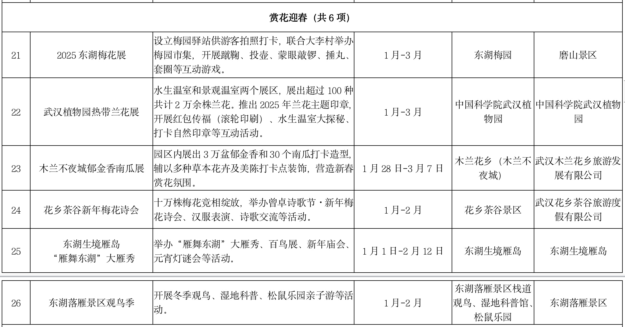 二是赏花迎春。举办各类新春游园、主题赏花活动。主要包括2025东湖梅花展、武汉植物园热带兰花展、东湖落雁冬季观鸟等活动,以及文创市集、迎春花卉游园等特色活动,邀请市民游客打卡体验。