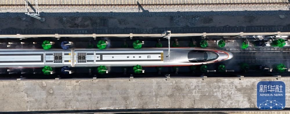 1月17日,在广州动车段深圳动车运用所,列车通过自动洗车机。自动洗车机配备有自动识别系统、喷淋系统、供水系统、水循环系统和机械洗刷系统等,能够在10分钟左右清洗完成一列16节编组高铁列车。