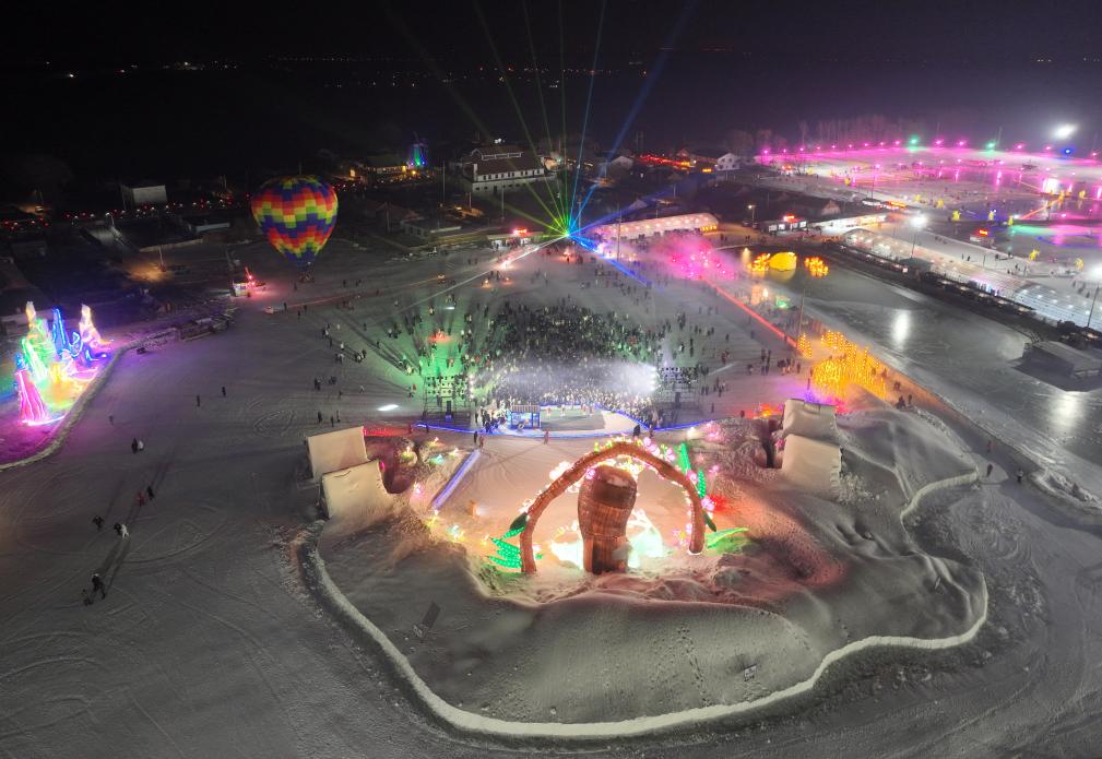 An aerial drone photo taken on Jan. 12, 2025 shows the night view of the rice paddy theme park in Shenyang, northeast China's Liaoning Province. (Xinhua/Li Gang)