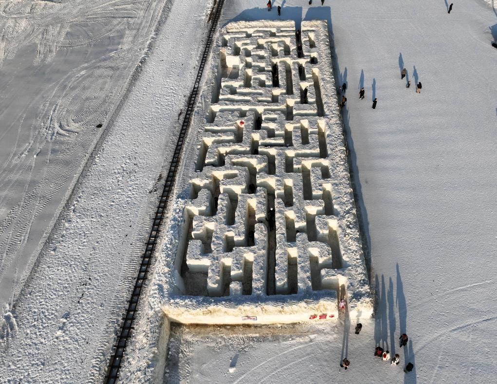 Visitors play at the snow maze in the rice paddy theme park in Shenyang, northeast China's Liaoning Province, Jan. 12, 2025. (Xinhua/Li Gang)