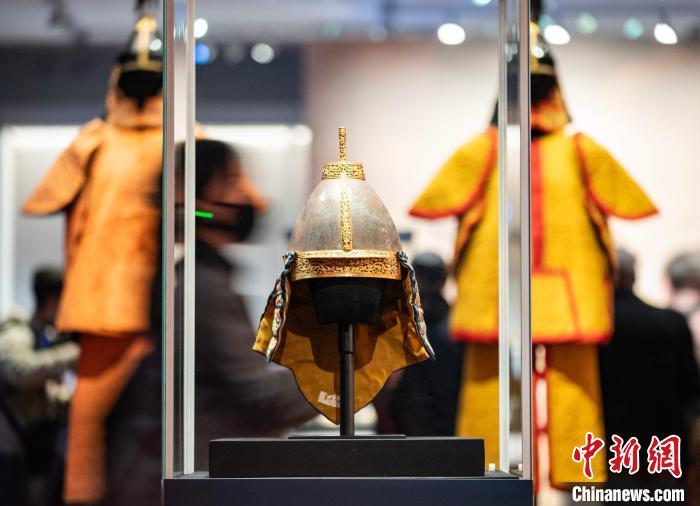 1月21日,“修明武备──故宫博物院藏清代军事文物”展览开幕典礼在香港故宫文化博物馆举办,展出约190件故宫博物院珍藏的清代宫廷文物。图为展出的国家一级文物“乾隆朝仿努尔哈赤御用盔”。 中新社记者 侯宇 摄